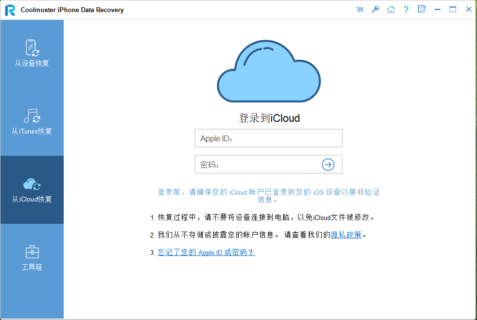 如果您想在不重置的情况下从 iCloud 备份恢复, Coolmuster iPhone Data Recovery是最佳选择。以下是使用 iPhone 数据恢复从 iCloud 备份恢复 iPhone 备忘录的方法: