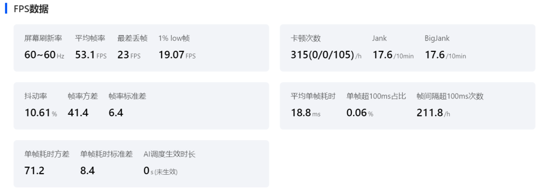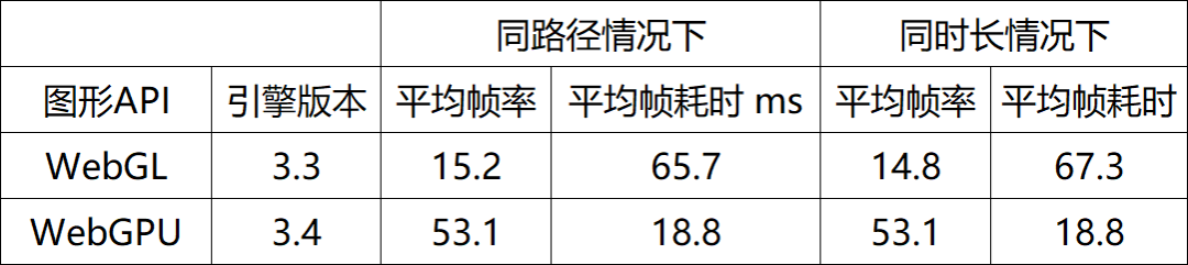 从测试结果来看,WebGL 模式平均帧率约为 14.8 FPS,平均帧耗时约为 67.3 ms,整体帧时间较高且存在明显性能压力。相比之下,新架构 WebGPU 帧率与帧时间均保持在较为稳定的水平,平均帧率均约为 53.1 FPS,平均帧耗时约为 18.8 ms。