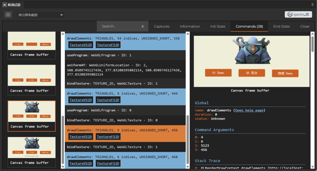 在 Spector.JS 中,Commands 与 Captures 是最常被关注的两个入口。Captures 用于管理已捕获的帧数据,每一次点击相机按钮,都会生成一次新的帧捕获记录,方便开发者在不同时间点或不同场景状态下进行对比分析。Commands 则展示了该帧中所有渲染指令的执行序列,包括每一次 drawCall、状态切换以及资源绑定操作。通过 Commands,开发者可以清楚地看到哪些渲染操作占据了主要开销,以及是否存在不必要的重复调用。