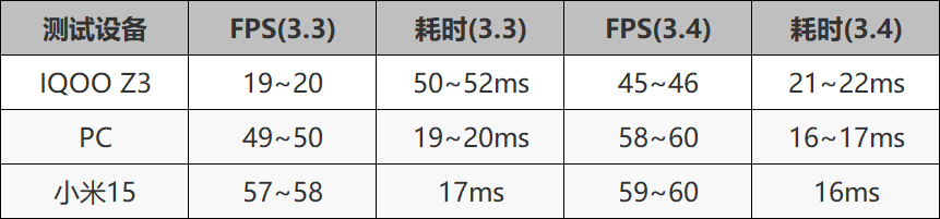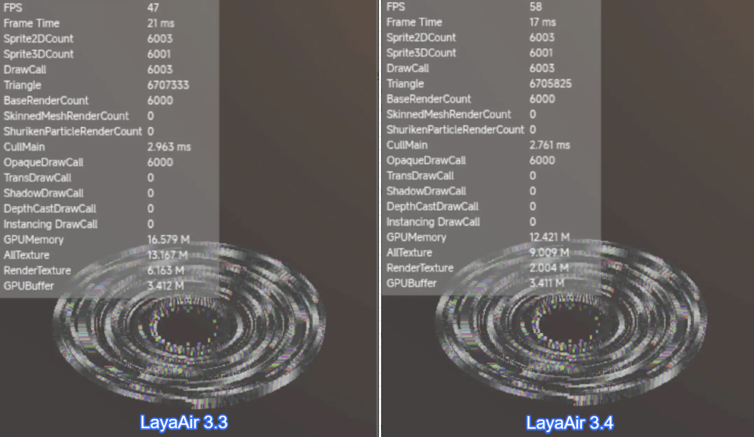 这些优化并非停留在理论层面。在实际设备测试中,同一渲染场景、6000 个 Draw Call 的条件下,对比 3.4 引擎与 3.3 引擎的测试结果显示: