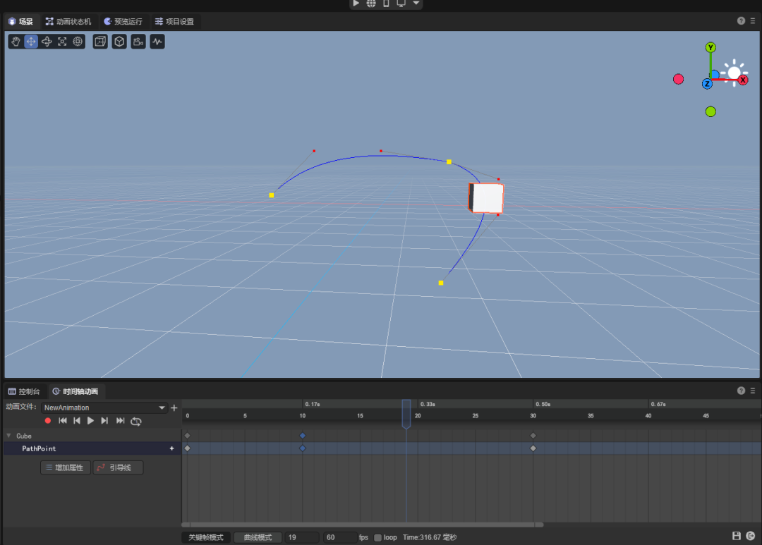 本次版本在时间轴动画体系中引入了动画引导线功能,为复杂运动轨迹的编排带来了全新的工作方式。该功能支持在 2D 与 3D 空间内实时显示并追踪物体的运动路径,将原本抽象的位移数据转化为直观、可见的视觉参考。通过在编辑器中直接观测运动轨迹的平滑度与走向,开发者能够以极高的精度掌控物体的位移节奏,大幅消除了传统工作流中依靠反复运行验证、盲调关键帧参数带来的低效与不确定性。