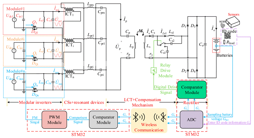 (1)模块化并联与电压调节:系统通过N个单开关逆变器模块并联组成主功率单元,每个模块包含直流输入滤波电容(Cini)、功率MOSFET(Qi)、LC并联谐振电感(Lri)与电容(Cri),通过调节并联模块数(n)与工作频率(80--90 kHz,参考SAE J2954标准),可实现220 V、330 V等多电压级输出,无需改动电路结构即可适配不同机器人的充电电压需求。