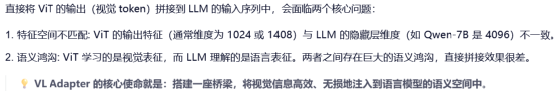 2)视觉-语言特征适配器:VL Adapter,cross attention层,负责从图像编码器输出结果中提取和文本最相关的视觉特征,将视觉特征转换为语言大模型可以理解的特征(语义对齐)