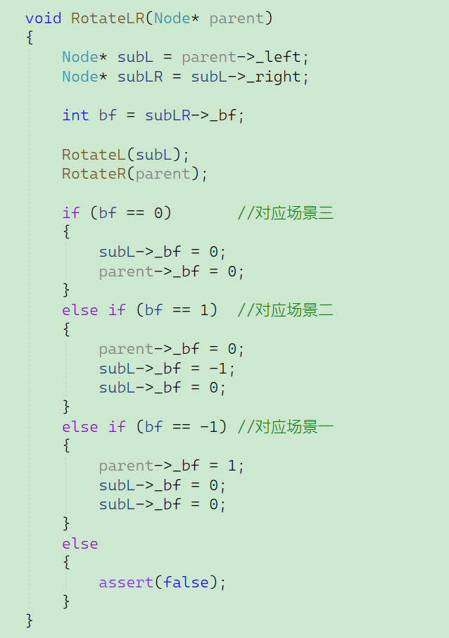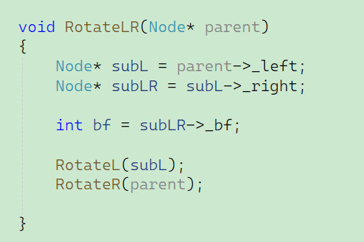 因为是对subL进行左单旋,对parent进行右单旋,所以这里直接复用了左单旋和右单旋的代码,因此位置关系得到了解决。那接下来去改正平衡因子,因为要改正平衡因子得确定旋转发生之后对应哪个场景,关键点在于subLR的在位置关系改变之前的平衡因子,所以我们先用 bf 变量存储下来。