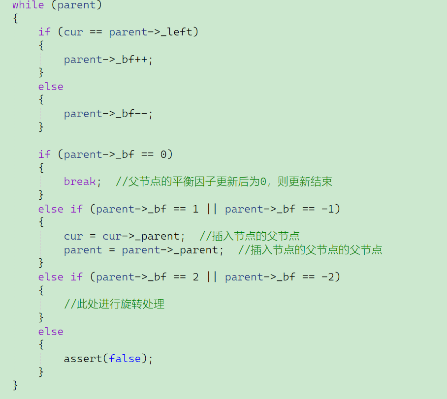 最后一个else语句中的assert(false)是为了应对,在插入这个数据之前,这棵树本身就不是一个AVL树,那就可以直接利用assert断言报错。另外while循环的判断条件是parent不等于nullptr,这是因为最坏的结果是一路更新到根节点,那么此时parent就是根节点,根据parent = parent->_parent;这句代码,parent就会被置为nullptr,至此循环结束。