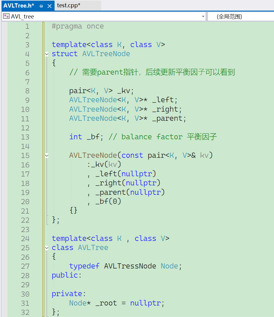 AVL树因为是一个特殊的二叉搜索树,所以结构和二叉搜索树是高度类似的,不过这里还多了一个平衡因子的变量以及一个_parent的指针,这个指针的作用后续会提及。