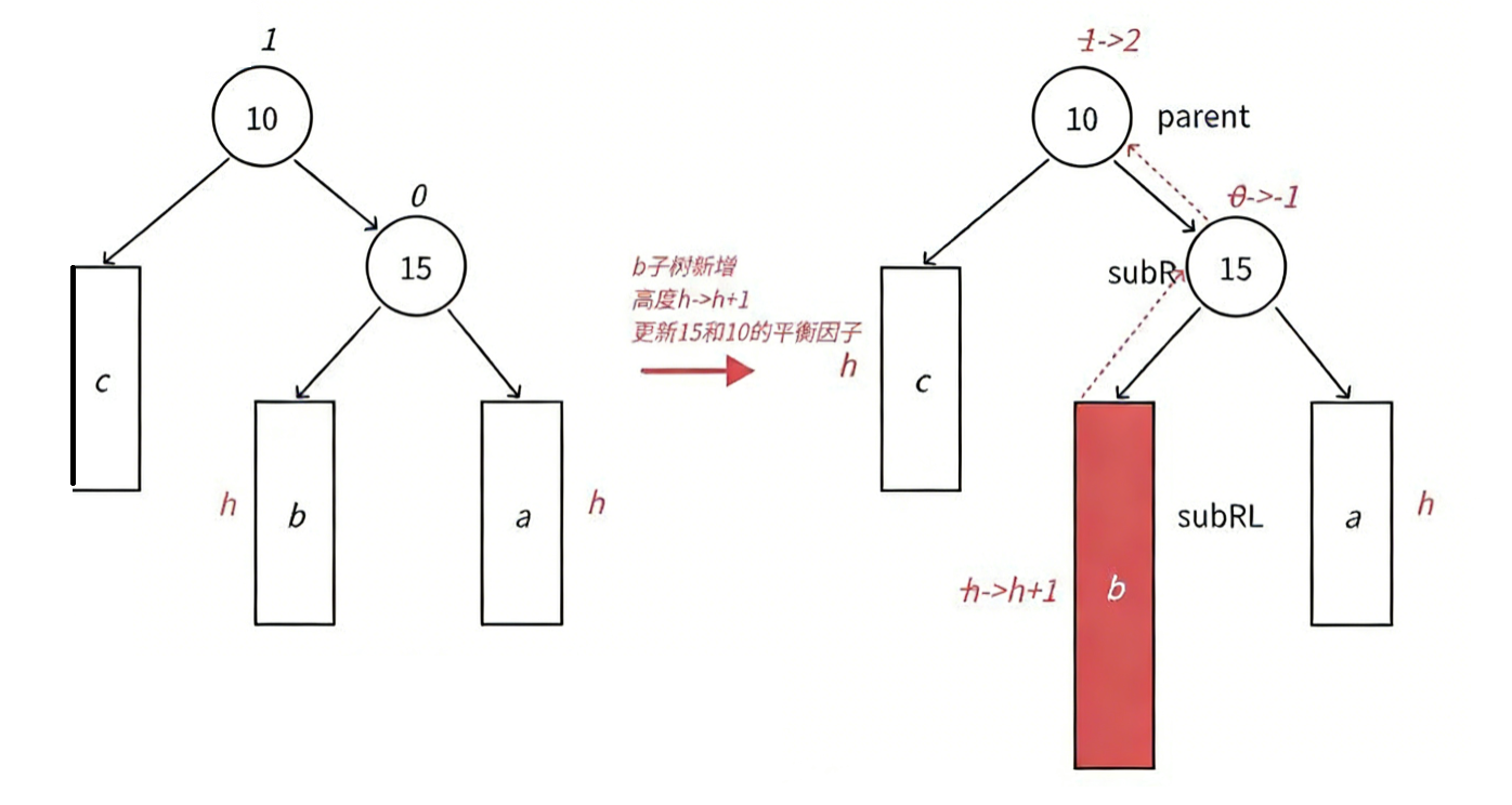 旋转核心步骤,因为 10 < b 子树的值 < 15,将 b 变成 10 的右子树,10 变成 15 的左子树,15 变成这棵树新的根,符合搜索树的规则,控制了平衡,同时这棵的高度恢复到了插入之前的 h+2,符合旋转原则。如果插入之前 10 整棵树的一个局部子树,旋转后不会再影响上一层,插入结束了。