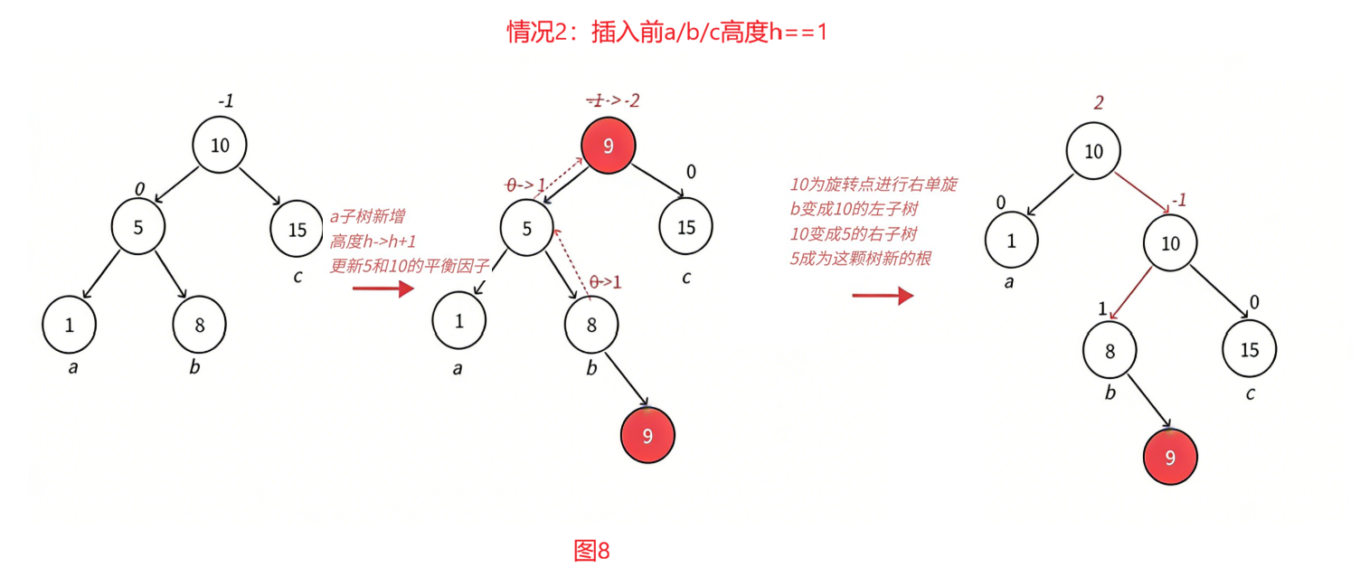 b 子树中新增结点的位置不同,平衡因子更新的细节也不同,通过观察 8 的平衡因子不同,这里我们要分三个场景讨论。
