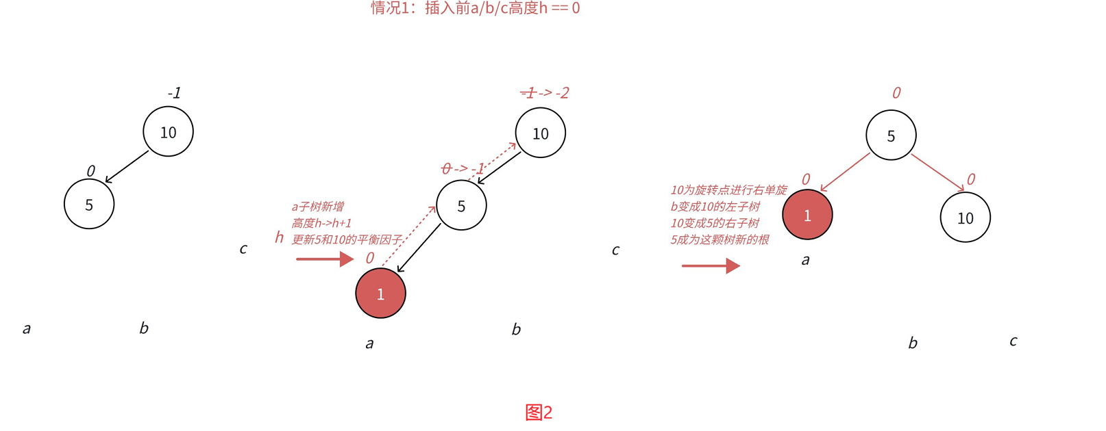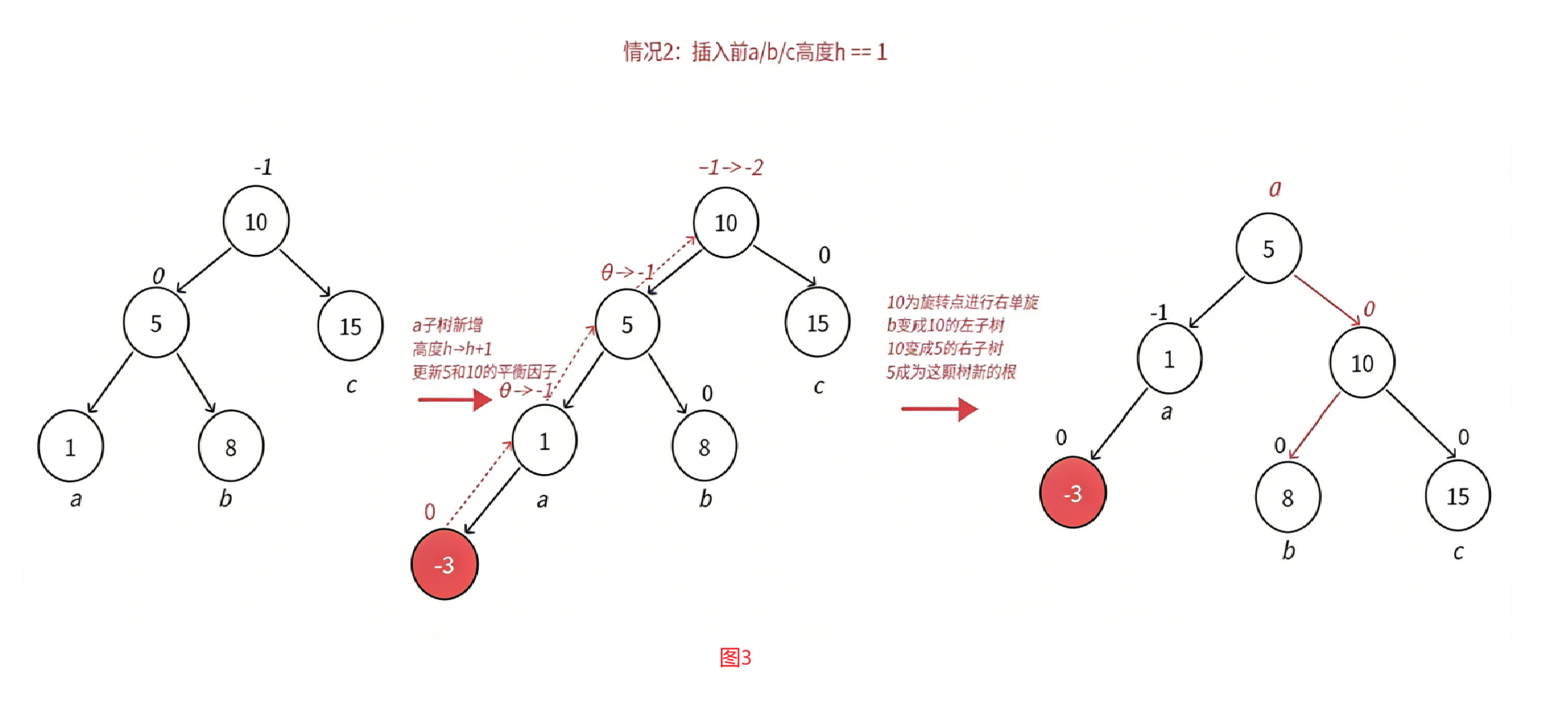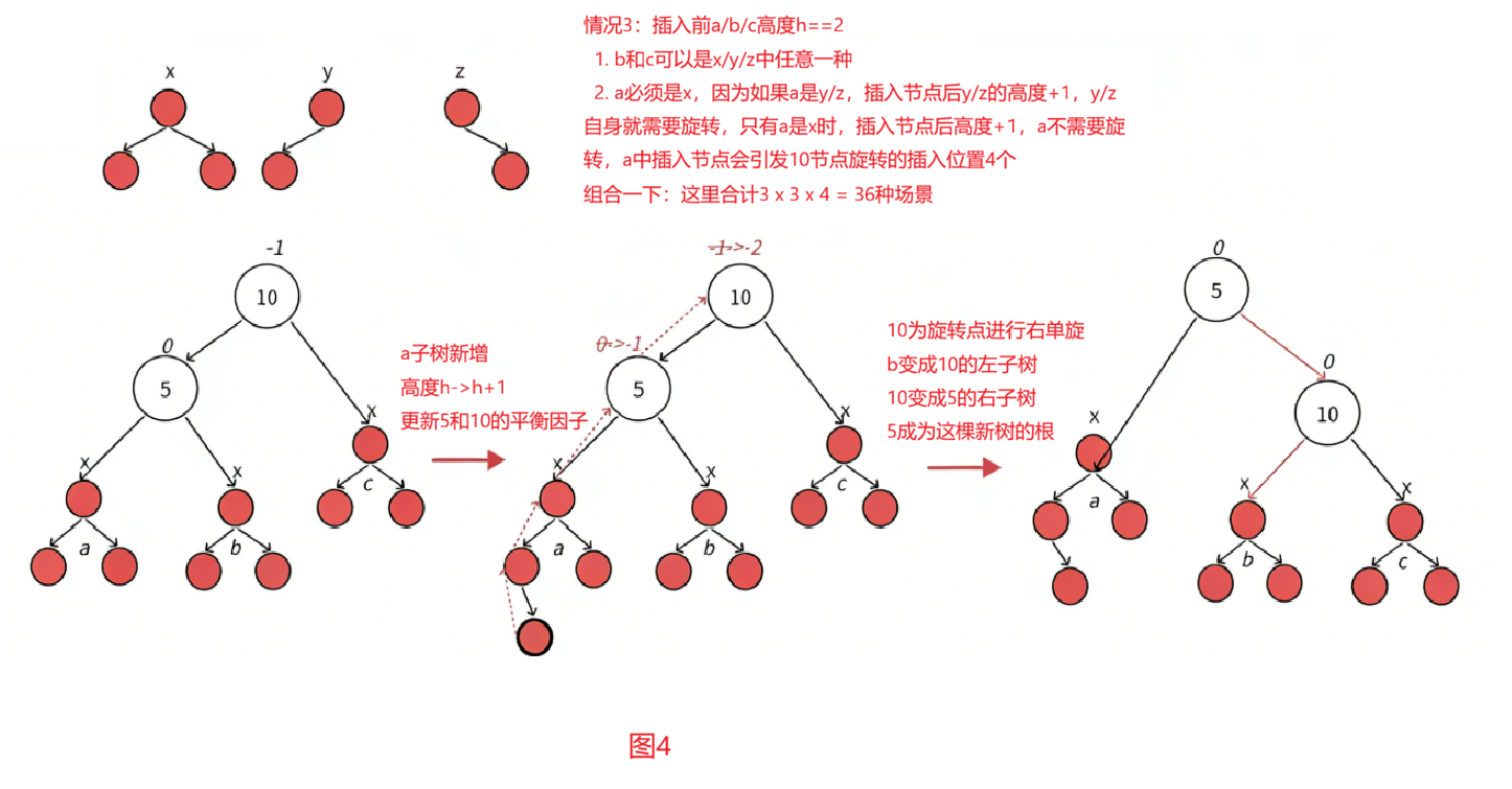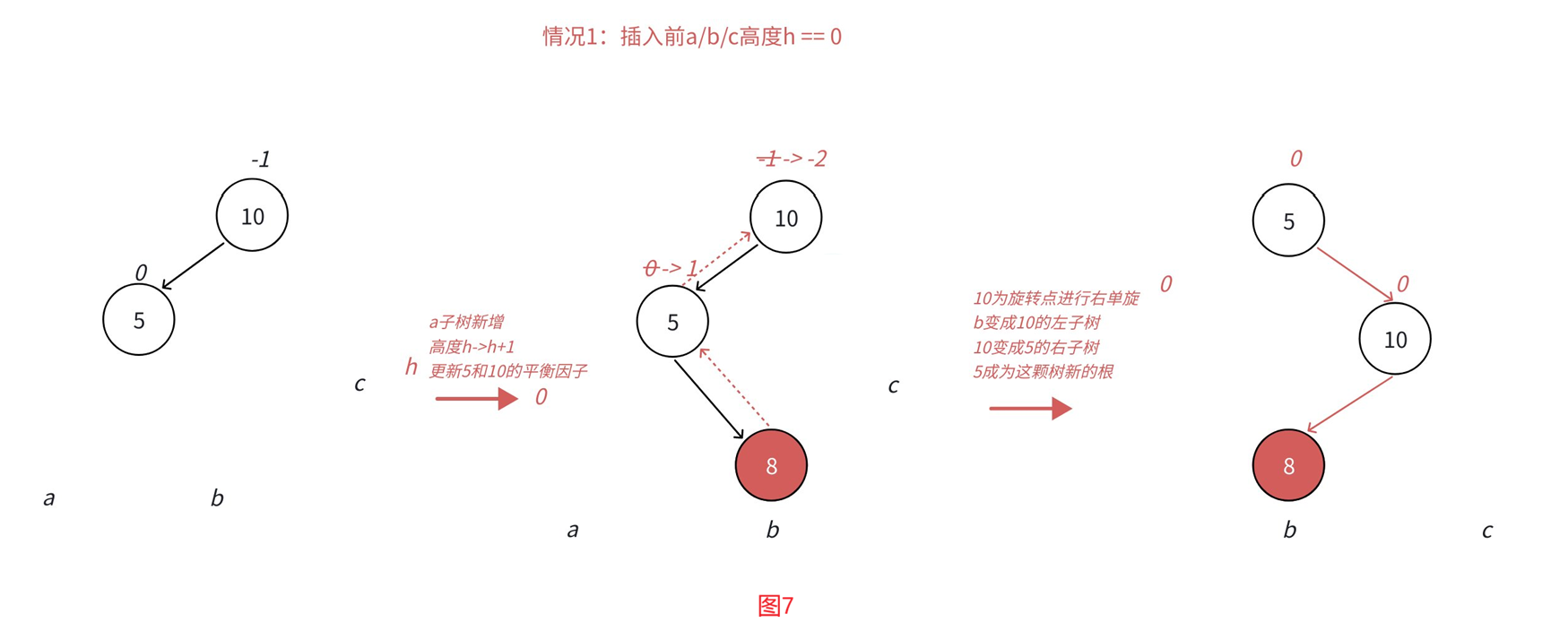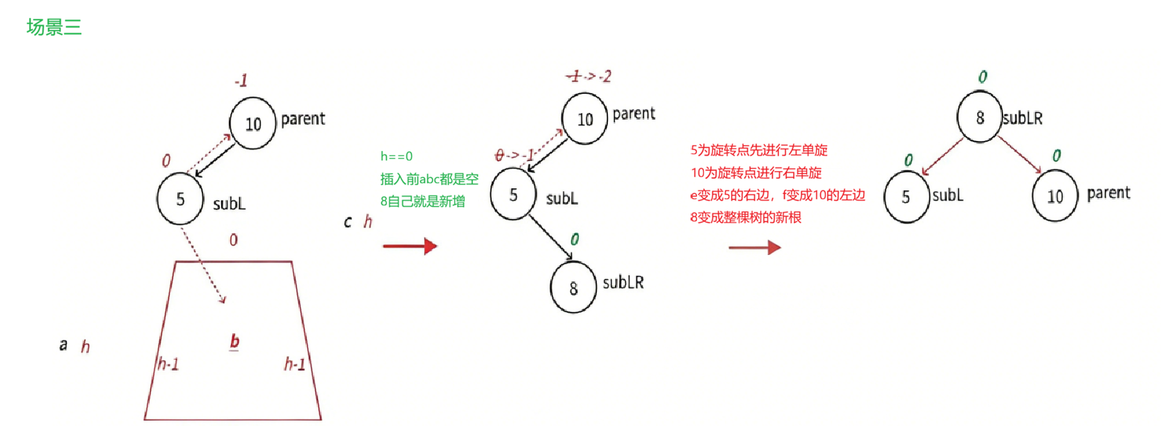 场景 3:h==0 时,a/b/c 都是空树,b 自己就是一个新增结点,不断更新 5->10 平衡因子,引发旋转,其中 8 的平衡因子为 0,旋转后 8 和 10 和 5 平衡因子均为 0。