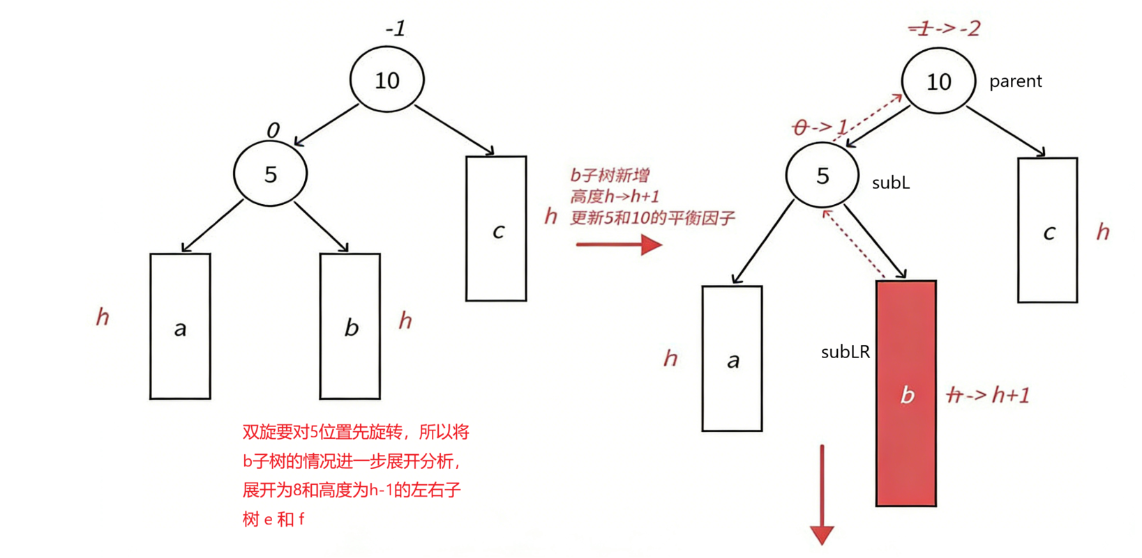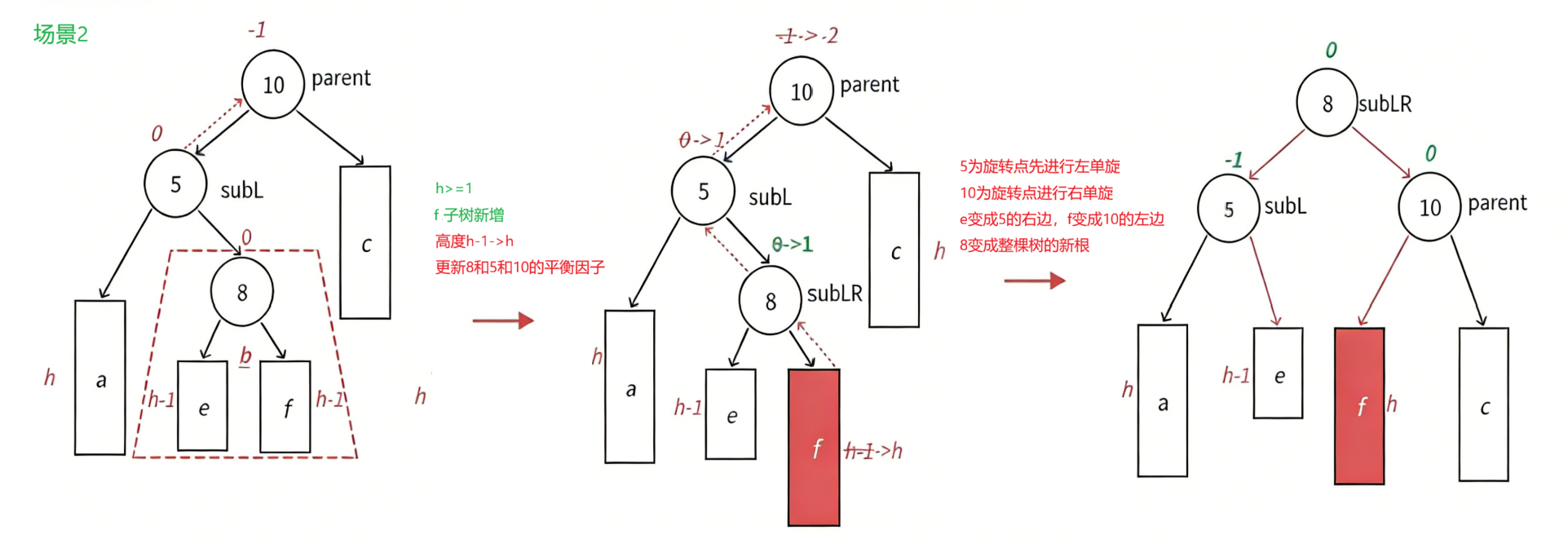 在这里大家可以发现一个共性:这里左右双旋的本质,实际上是把b子树的根节点的左右子树,分别交给subL和parent两个节点,并且e对应subL的右子节点,f对应parent的左子节点,然后subL和parent分别变为subLR的左右子节点 ,这个位置关系是不会改变的。而之所以要分成两个场景,是因为插入的节点在e后面还是f后面,会影响到subL和parent这两个节点的平衡因子。