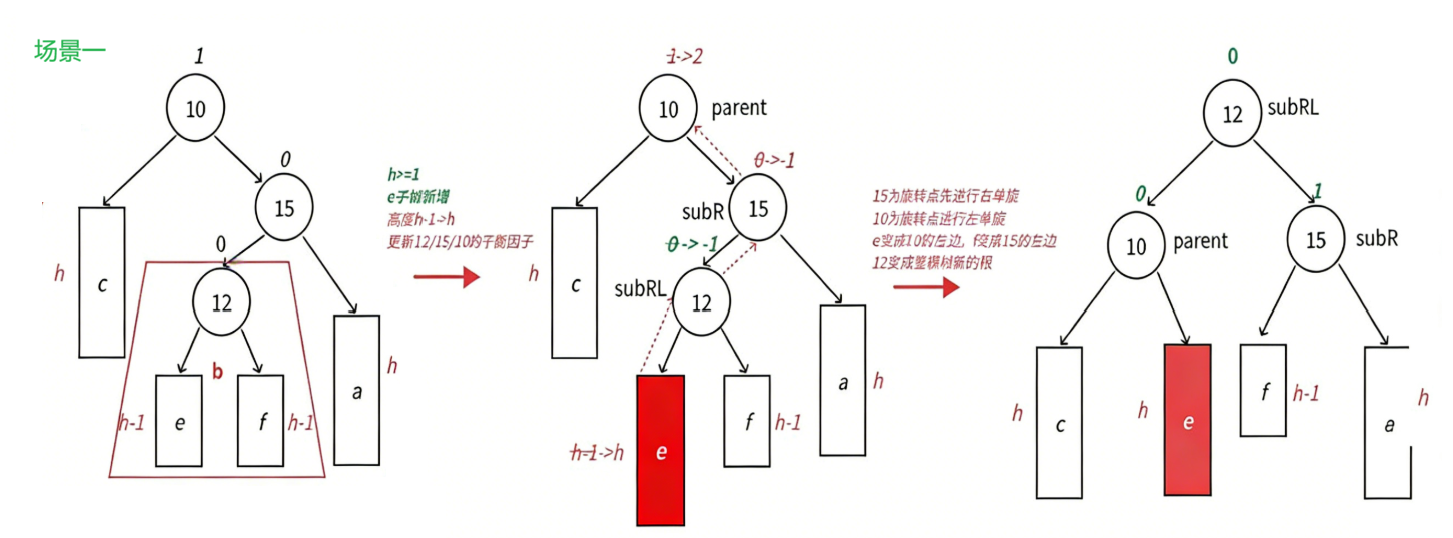 跟左右双旋类似,下面我们将 a/b/c 子树抽象为高度 h 的 AVL 子树进行分析,另外我们需要把 b 子树的细节进一步展开为 12 和左子树高度为 h-1 的 e 和 f 子树,因为我们要对 b 的父亲 15 为旋转点进行右单旋,右单旋需要动 b 树中的右子树。b 子树中新增结点的位置不同,平衡因子更新的细节也不同,通过观察 12 的平衡因子不同,这里我们要分三个场景讨论。