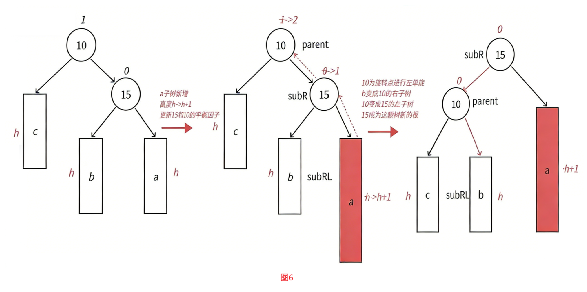 本图 6 展示的是 10 为根的树,有 a/b/c 抽象为三棵高度为 h 的子树 (h>=0),a/b/c 均符合 AVL 树的要求。10 可能是整棵树的根,也可能是一个整棵树中局部的子树的根。这里 a/b/c 是高度为 h 的子树,是一种概括抽象表示,他代表了所有左单旋的场景,具体跟上面左旋类似。