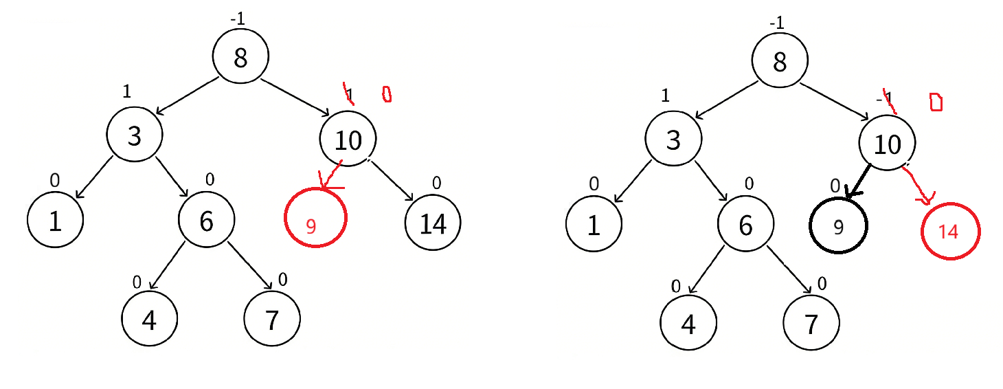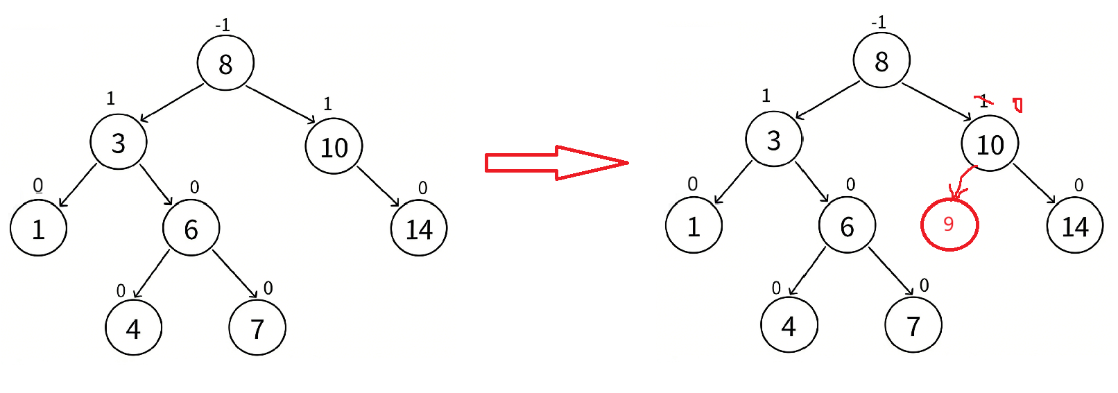就像这样,在原先的AVL树种插入一个节点 9 ,那么 9 的祖先节点中的节点 10 的平衡因子需要改变,因为新插入的节点影响了其父节点的左右子树高度差,但是对根节点的左右子树高度差没有影响。
