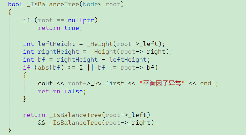 检查的方式就是求出每个根节点的左右子树高度,求出差值之后再和当前的平衡因子作比较,如果相等,那就合格,否则就不合格。
