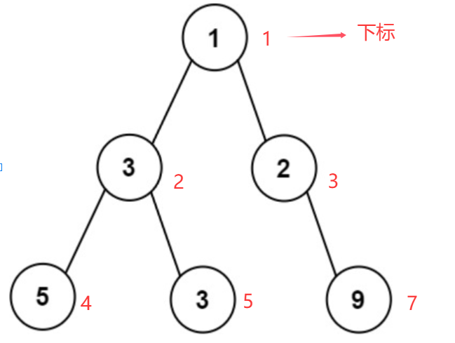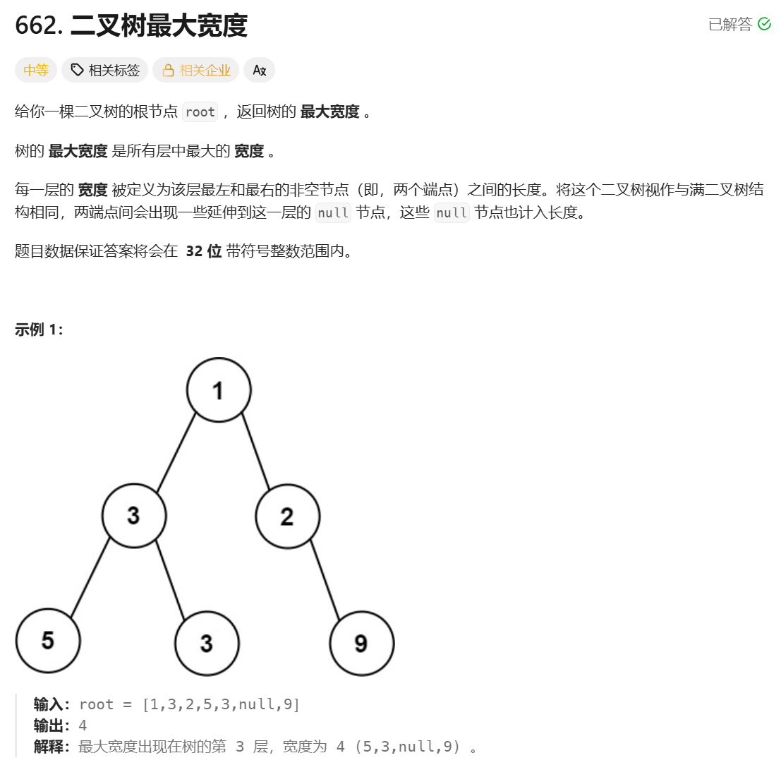 **思路:**还是借助栈遍历二叉树(下面代码使用数组模拟的栈),利用数组存储二叉树的方式(也就是堆),给每个节点编号,然后栈存储 pair<TreeNode*, int> 类型,其中 pair 中的 int 是用来存储编号的。我们设第一个节点编号是 1,然后设每个父节点编号为 x,那么每个孩子节点的编号就是 2x(左孩子),2x + 1(右孩子)。如果设第一个节点编号为0,那么每个孩子节点编号就是 2x + 1(左孩子),2x + 2(右孩子)。下面代码设第一个编号节点为 1(设成 0 也不影响,只是计算孩子编号的公式变化一下)。这样每层节点的数量其实就是这一层第一个节点的编号减去这一层最后一个节点的编号加 1(就是这两个编号中间的节点个数在加上这两个编号代表的节点),这样算出来的节点数量是计算了 null 的。所以只需要层序遍历,然后通过上述方式计算每层的节点个数,不断更新,最终得到最大的节点个数。