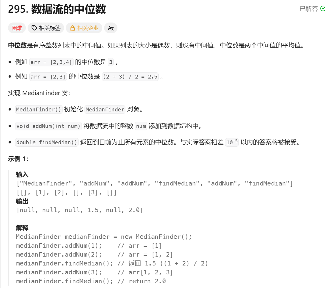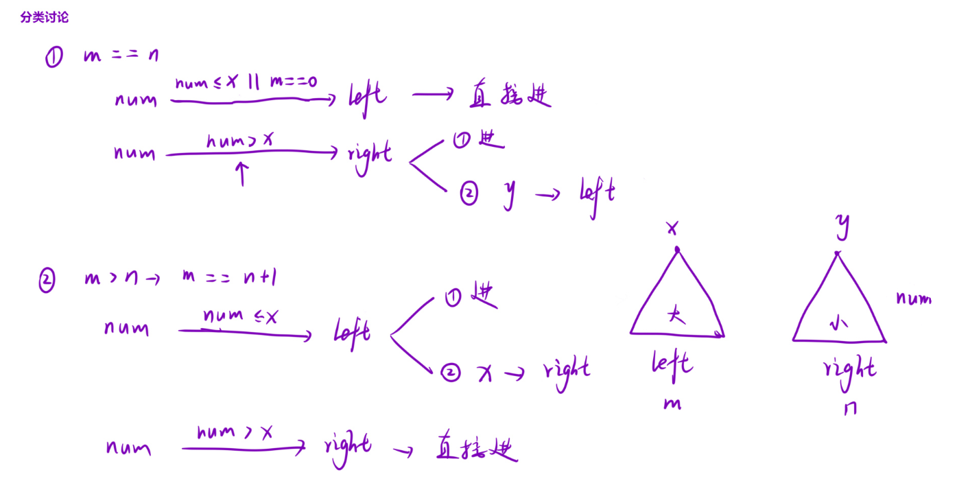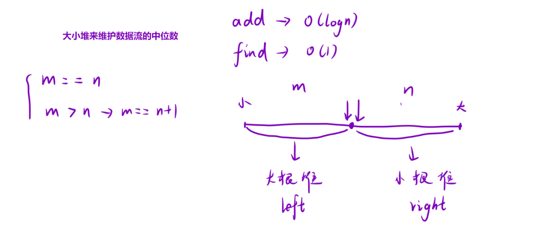 **思路:**使用两个堆,一个大堆,一个小堆,当数组元素个数为偶数,两个堆各存一半,当数组元素个数为奇数时,大堆比小堆多存一个(小堆多存也可以,下面代码是让大堆多存一个)。存储规则如下图: