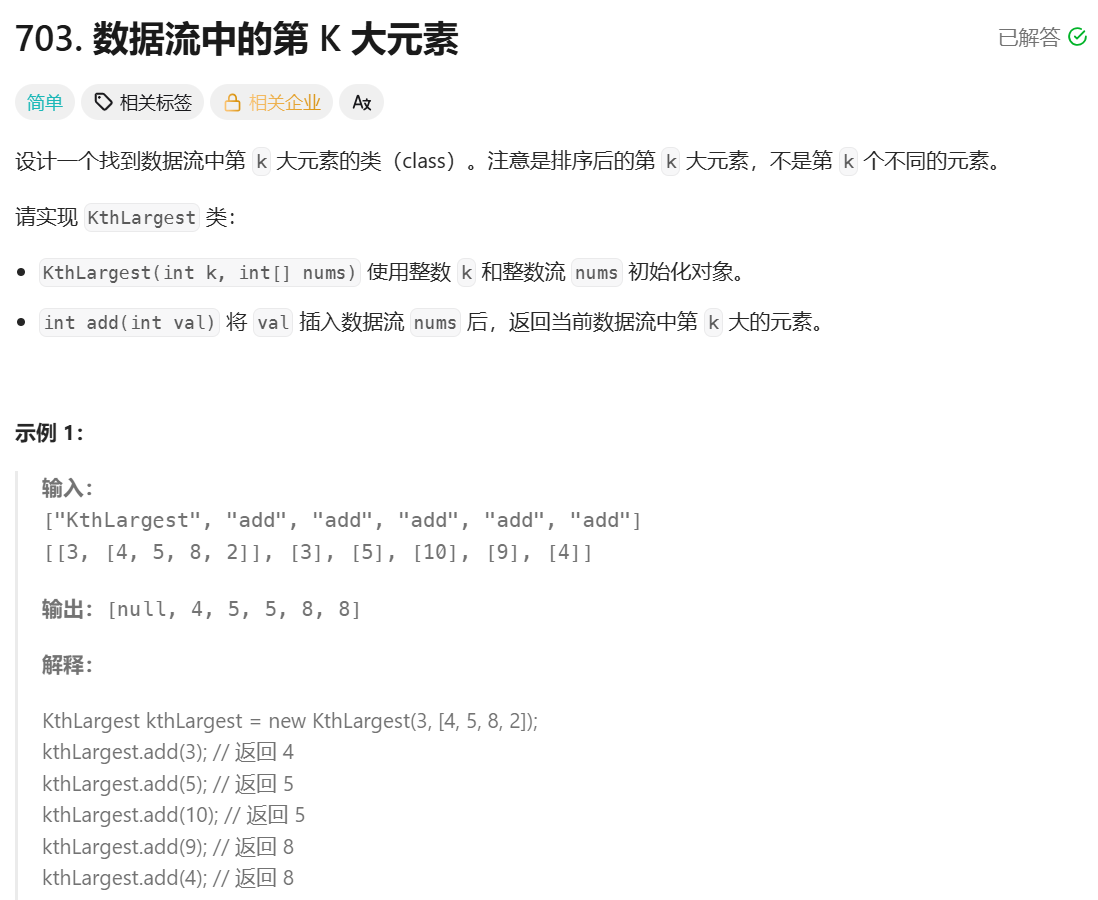 思路: 这道题是求第 K 大的元素,应该创建一个大小为 K 的小根堆,然后遍历数组,所有数据一次进堆,如果堆的大小超过 K,就将堆顶元素扔出。最后堆顶就是第K大的元素。