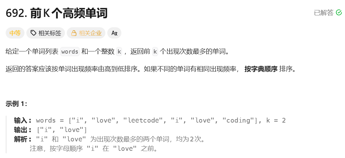 **思路:**首先使用一个哈希表,统计一下每个单词出现的次数,然后创建一个大小为 K 的堆,对于频次而言,需要小根堆,对于字典序而言(频次相同的时候),需要大根堆。遍历哈希表,让所有元素依次进堆,然后判断堆数据个数是否超过 K,如果超过就丢弃堆顶元素,直到个数小于等于 K。遍历结束后,堆中的数据就是结果了。