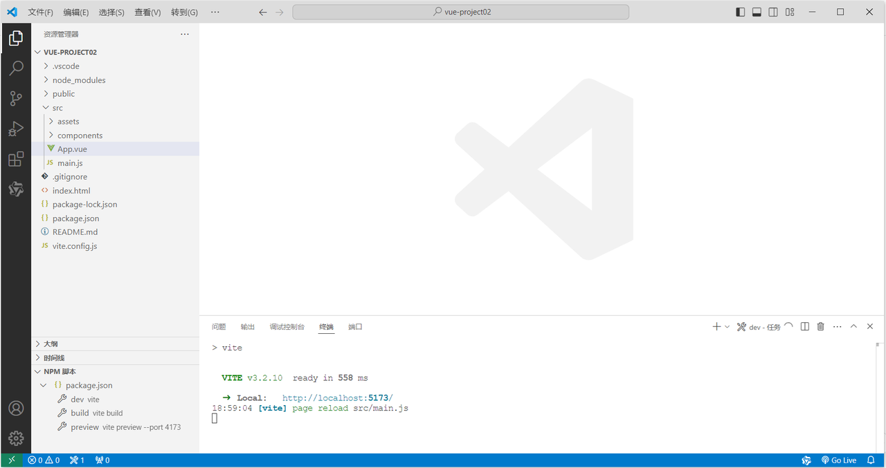 启动项目,我们可以在命令行中执行命令:npm run dev,就可以启动Vue项目了。