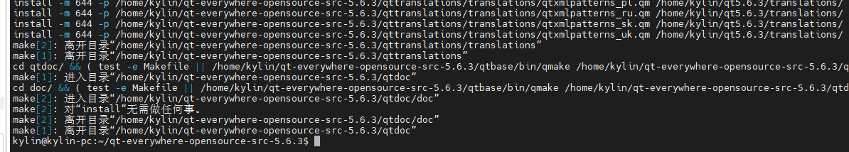 make install #安装目录在/home/kylin/qt5.6.3 这一步时间挺久的,耐心等待
