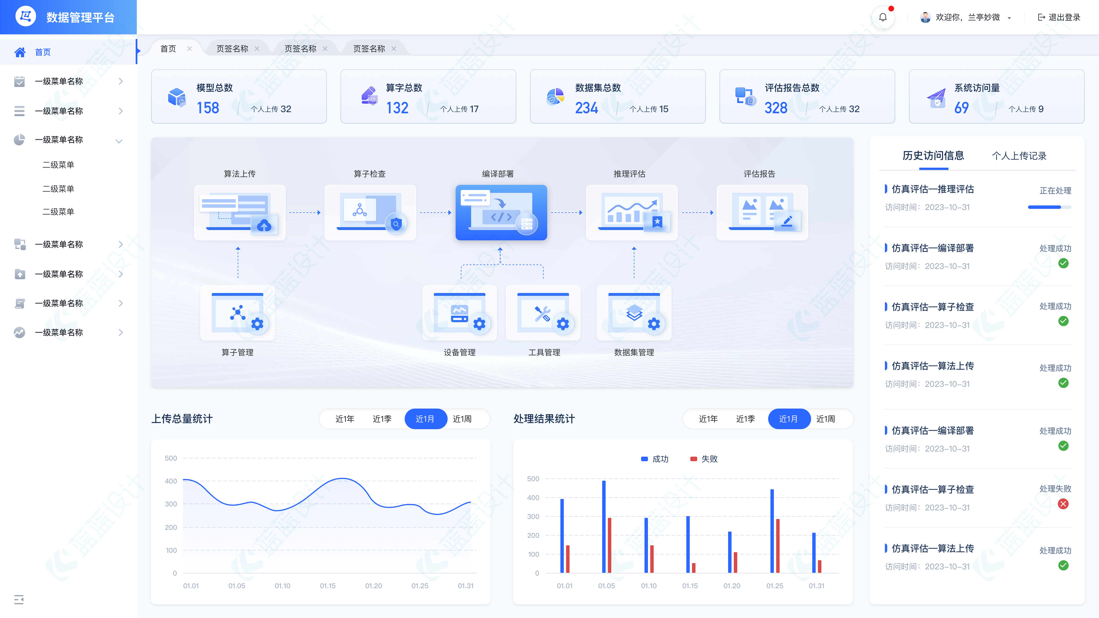 该系统的原首页中信息量比较少,在设计时除了对页面美观的优化,从内容、布局、用户使用场景、使用习惯、交互方式等方 面也进行考虑,增加了一些统计的图表, 「历史访问信息」采用卡片式列表,突出模块和内容。同时增加「个人上传记录」信息和「历史访问信息」可以进行 切换查看。