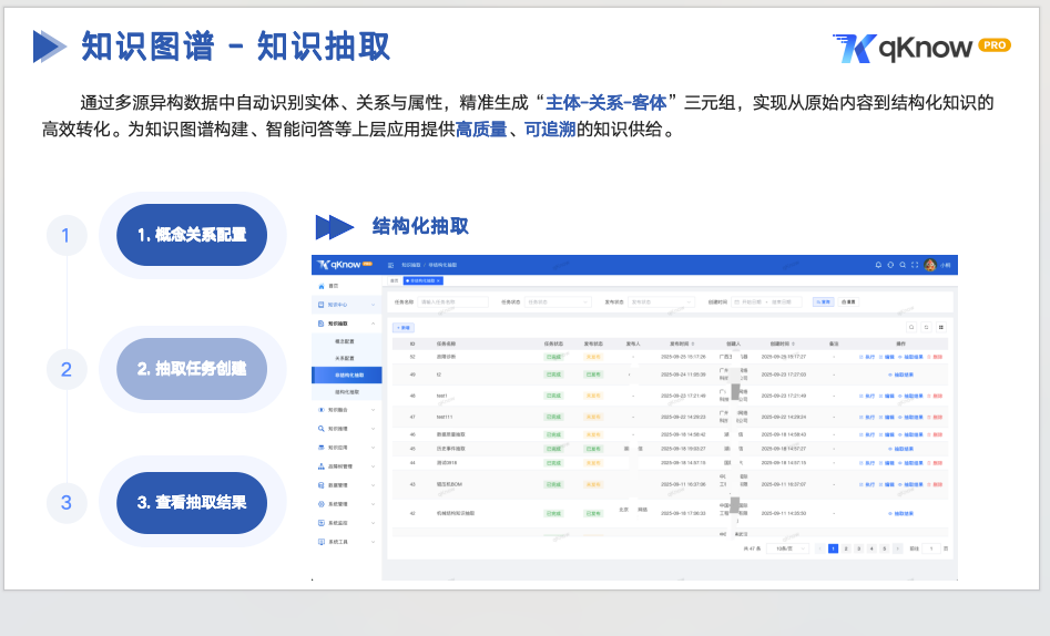 在 qKnow 知识平台中,结构化抽取不仅追求"抽得出来",更关注 结果是否准确、是否可追溯、是否可持续更新,从源头保障知识质量。