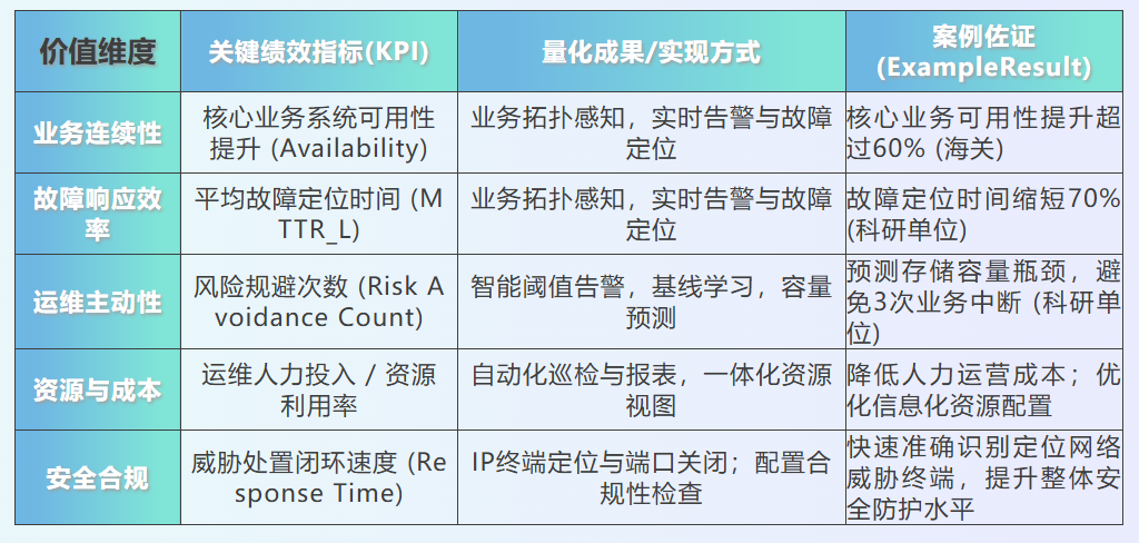 这种主动式运维模式不仅显著缩短故障平均修复时间(MTTR),保障核心业务的连续稳定,还能减少人工巡检投入,并将分析结果用于资源规划和配置优化,为政府管理层提供更具依据的决策支持。
