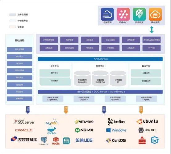 平台以OneCMDB统一数据中心为技术底座,集中汇聚并关联网络、主机、数据库、虚拟化、安全设备等各类监控源的细粒度数据,从根本上解决了运维数据分散与孤岛化问题。