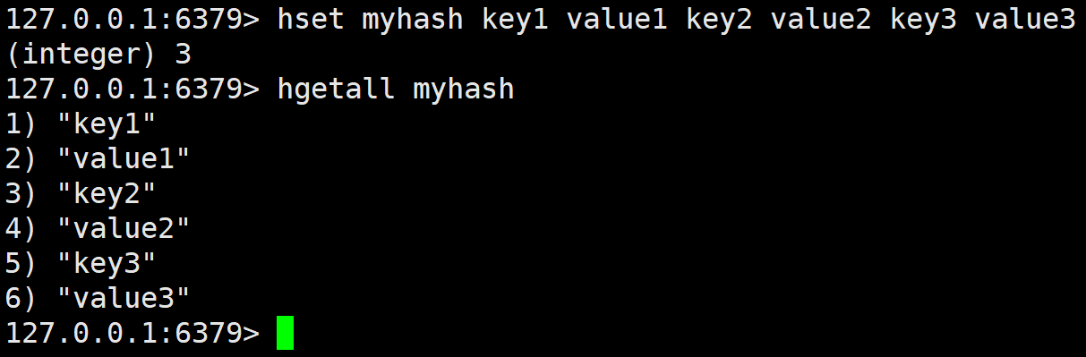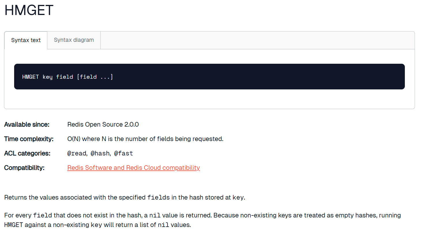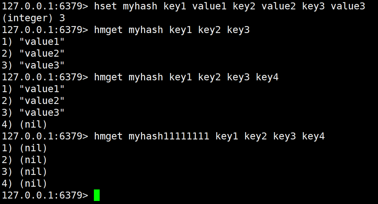 对应的 field 不存在,那么就会返回 nil,如果 key 不存在,那么有几个 field 就返回几个 nil。有 hmget,那么有没有 hmset 呢?其实是有的,但是 hset 本身就能设置多个,所以功能重合了。