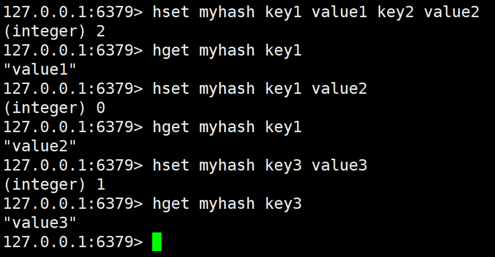 由于Redis本身就是哈希的形式,它自身的键值对称为 key - value,而对于哈希数据类型,也就是 key - value 的 value 是哈希,那么这时称其为 field - value,为了区分开。那么 hset 对于 key 不存在的场景,会自动创建,如果存在,就会向其中添加 field - value,如果 field 存在,就会进行覆盖,该指令返回新增到哈希表中字段的数量。注意这里的hash的 field - value 都只能是字符串,不能像 Redis 的顶层哈希一样能存各种数据结构,可能本身出于轻量化的考虑吧。