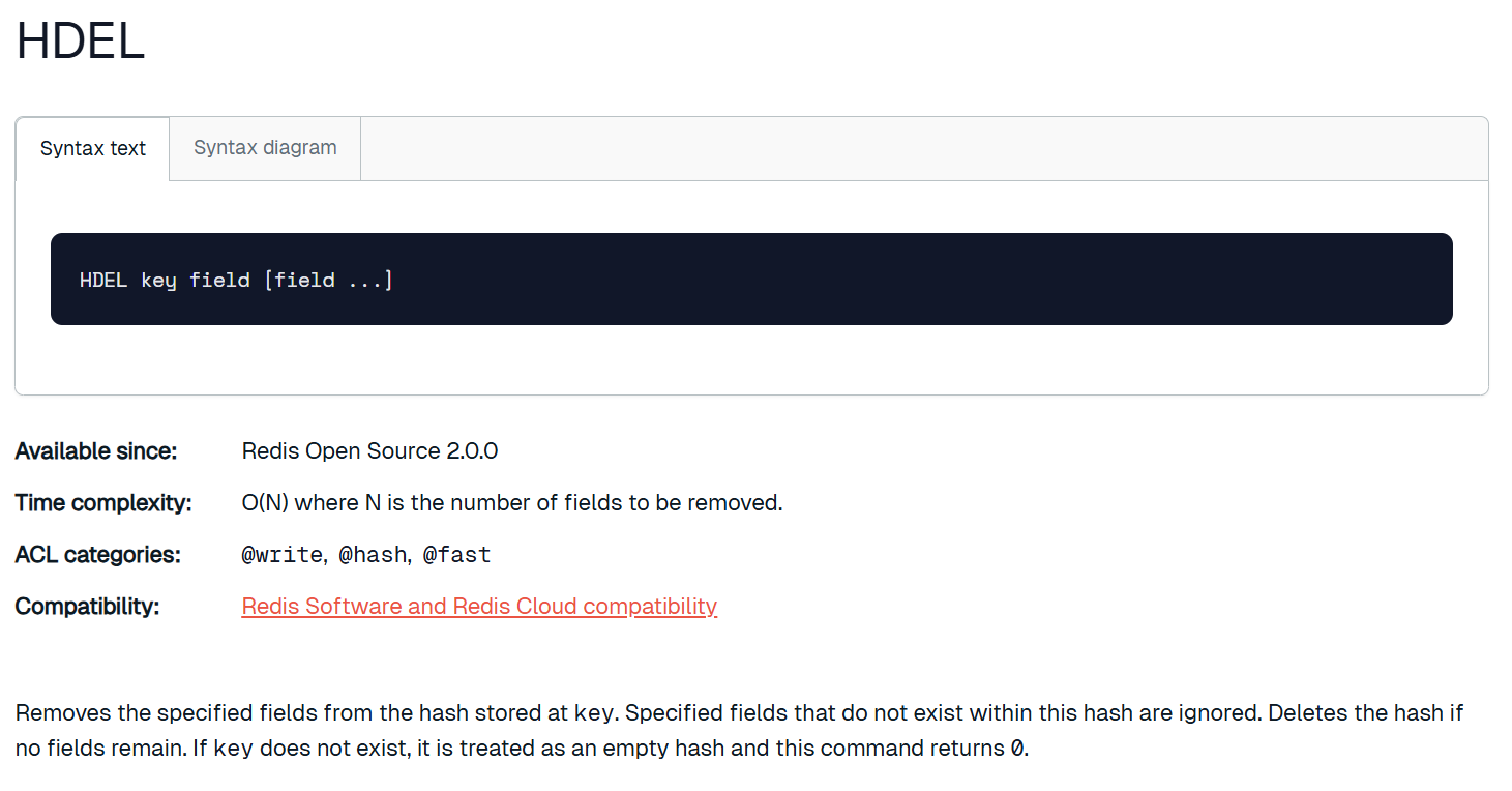删除的是 field,del 删除的是 key。返回值是本轮操作删除的字段数量。