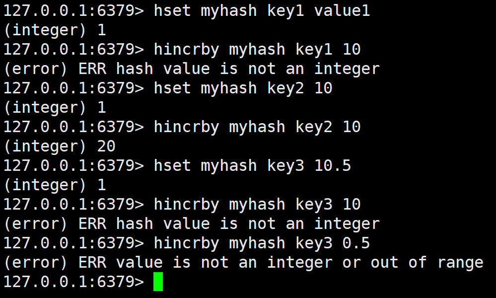 注意 value 得是整形,然后小数的计算也是不行的。这里因为计算这块用的少,也没有提供诸如 hdecrby 的指令,但是我们可以通过加上负数的方式实现减法。