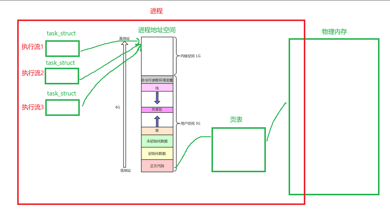 进程是承担分配系统资源的基本实体(进程 = 内核数据结构(多个执行流结构体+进程地址空间+页表) + 代码和数据)