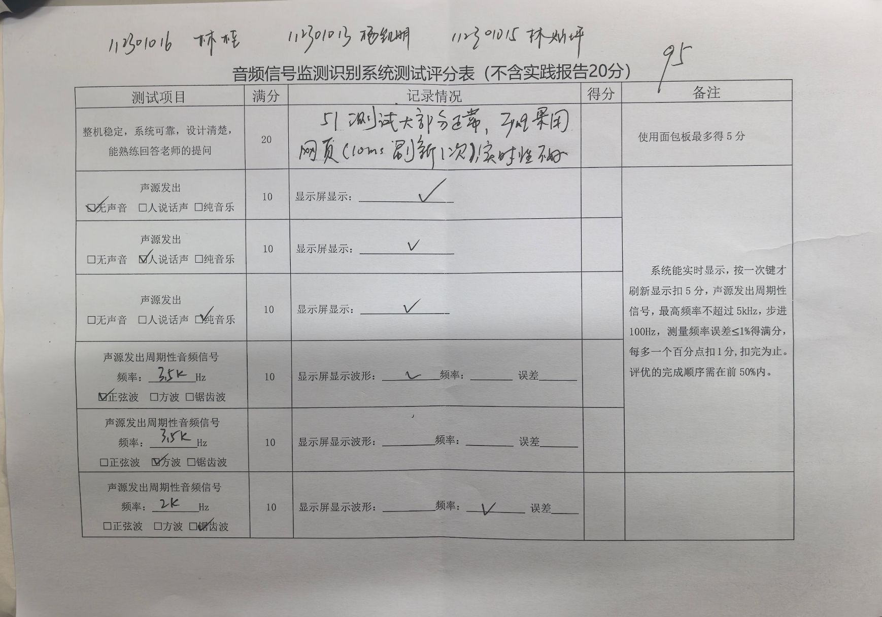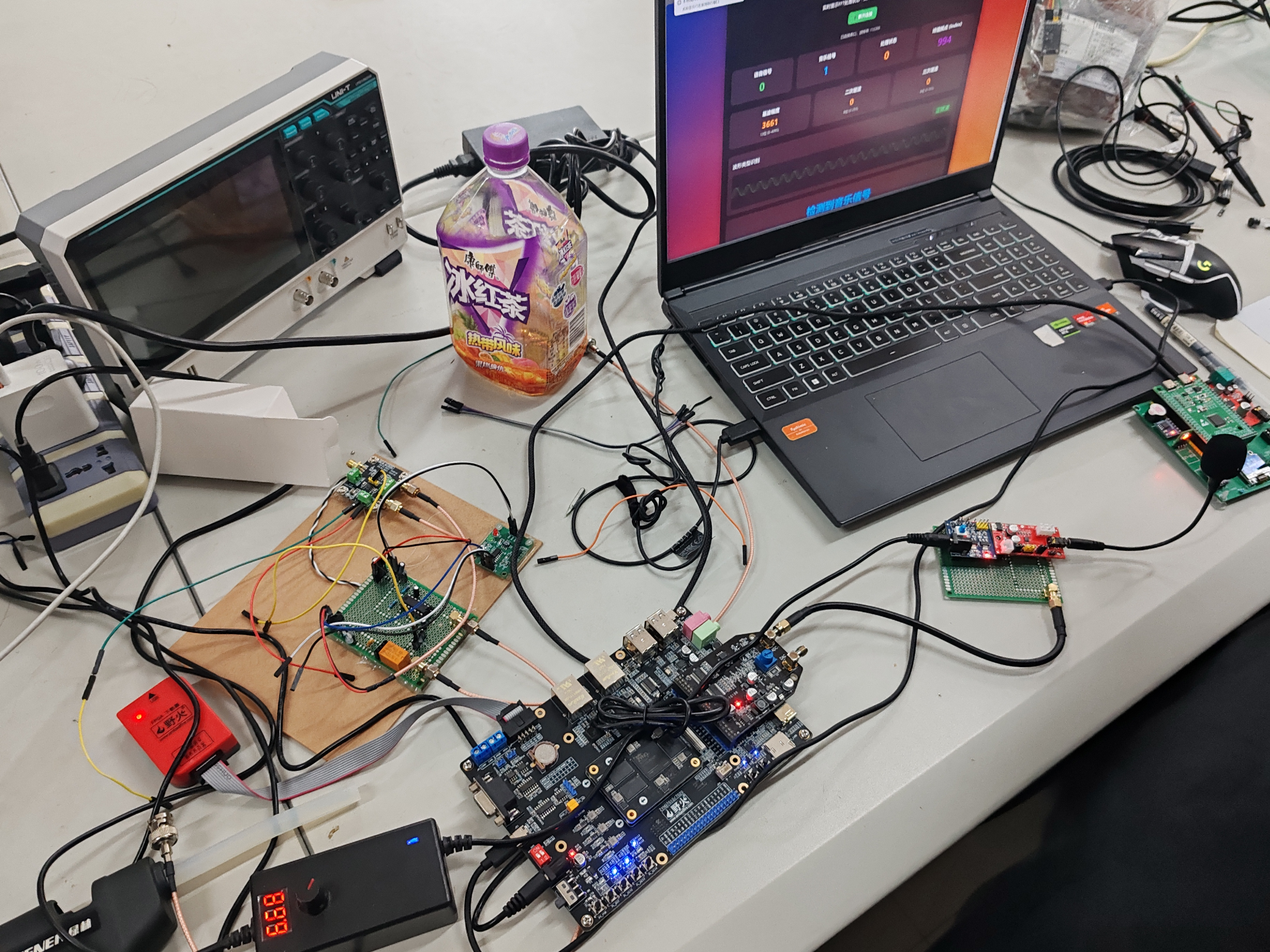 本次设计的效果较为优秀,在最终测试中****获评79(不含报告总分80)****的优秀成绩。在经过两个礼拜的程序调整与增强、电路设计与提高之后,在识别准度、识别速度上都有显著提升,设计的预期目标全部达成。系统在多数测试场景下能稳定识别常见音频信号类型,响应时间控制在200毫秒以内,满足实时性要求,误识别率较低。