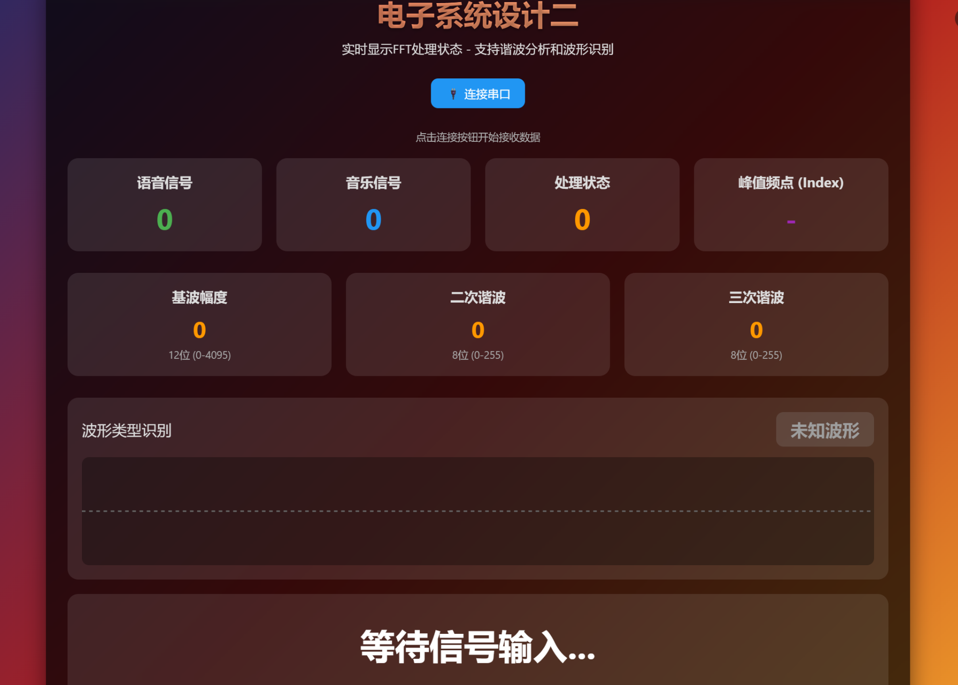 基频及其谐波分量的识别结果通过AXI总线传输至PS端,由ARM处理器进行最终判决与状态输出,结合预设阈值判断信号失真程度,并通过串口将基频、谐波含量及失真分析结果实时上传至网页上位机。同时显示主频频点、主频幅度、谐波分量强度以及判断结果,构成良好的人机交互。