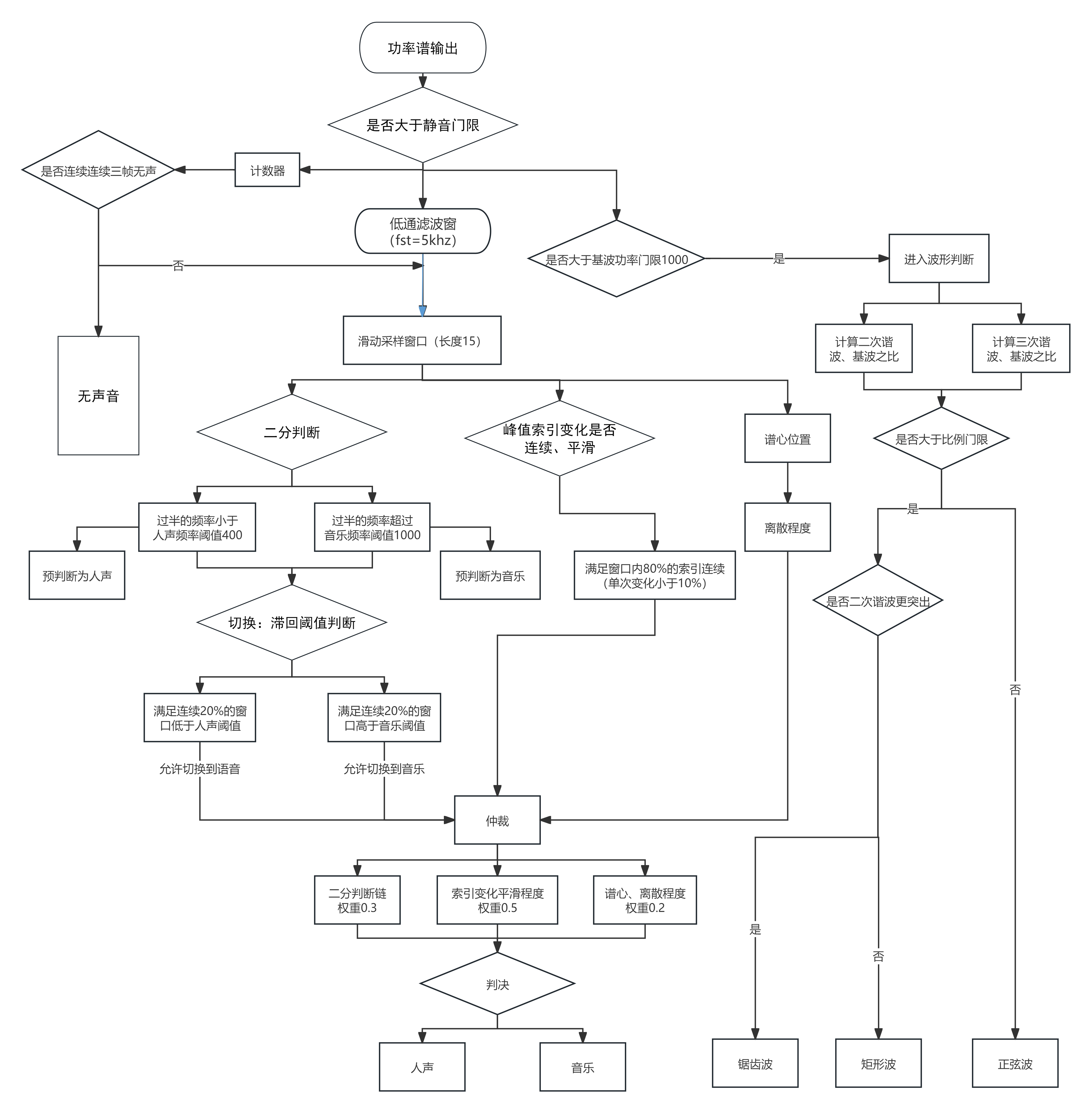 纯音乐测试方面,这里是技术的重灾区。对于西洋乐器,如钢琴、萨克斯、小提琴等乐器,音色明亮、音调高,识别判断非常容易,但是识别民俗乐器的时候,如埙、竹笛、编钟等音色浑浊、音调低的音乐,极容易识别为人声。为此,我们对频谱进行实时观察,找到了一个所谓的"缓带":在低频区域(1000Hz以下),人声的发声规律是不规则的,由于咬字的不同,发声的频谱有高有低,在低频区的跳动比较大(方差大),在1000Hz以下可以视为在100Hz-500Hz之间跳动;然而民俗乐器如埙等,演奏出来的声音连续性好,即频谱的连续性更好,音调之间的过渡效果更好,并且我们发现音乐的低频区域基本都在300Hz以上(约80%),因此加一个滑动判断窗来判决音乐频段的效果会很好。所以,我们在原来的基础上加入了新的判断窗机制(详见代码或者逻辑判断图),能够较精准地分辨出音乐和人声。