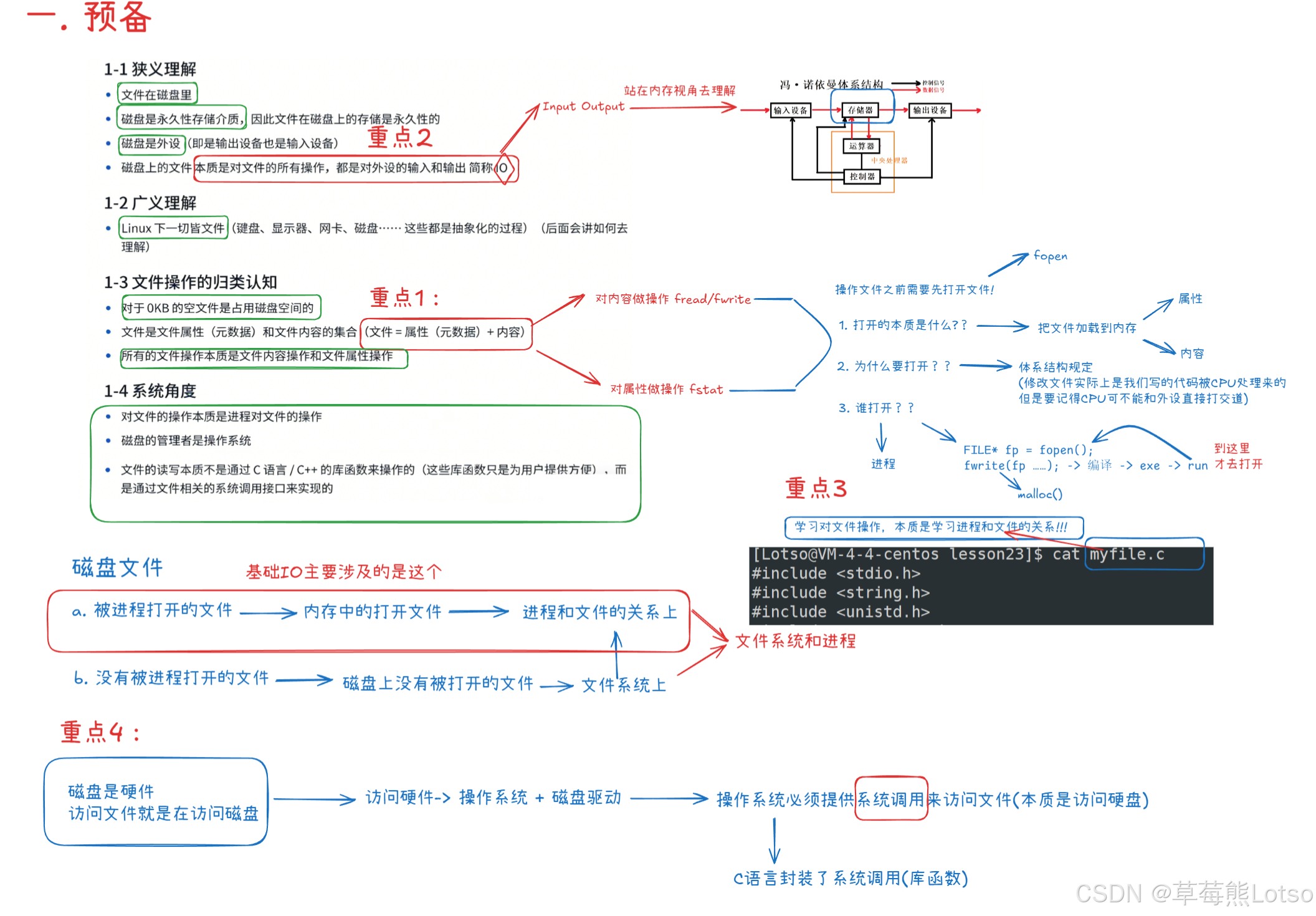 Linux 下 "一切皆文件",键盘、显示器、网卡、进程等都被抽象为文件,统一通过 IO 接口操作,在之后的学习中会深入理解这一概念; - 系统角度 :文件操作的本质是