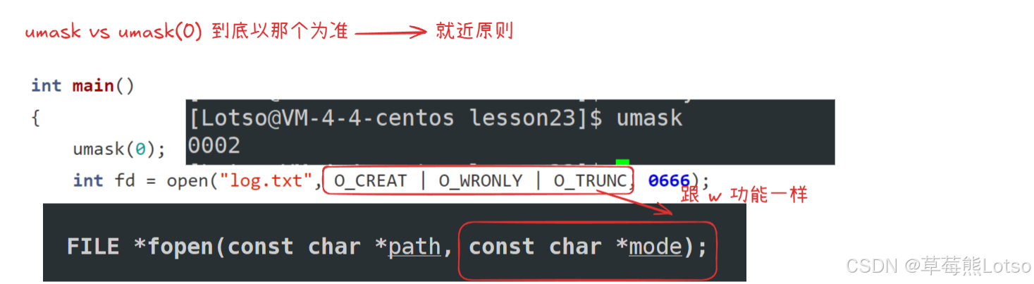 mode参数指定的是文件的 "默认权限",最终权限会被umask(权限掩码,以前就学习过了)修正,公式为:最终权限 = mode & ~umask 。举例:默认umask为0022,因此mode=0666时,最终权限为0644。在下面我们还会再涉及到这个的,并且提到了一个就近原则。