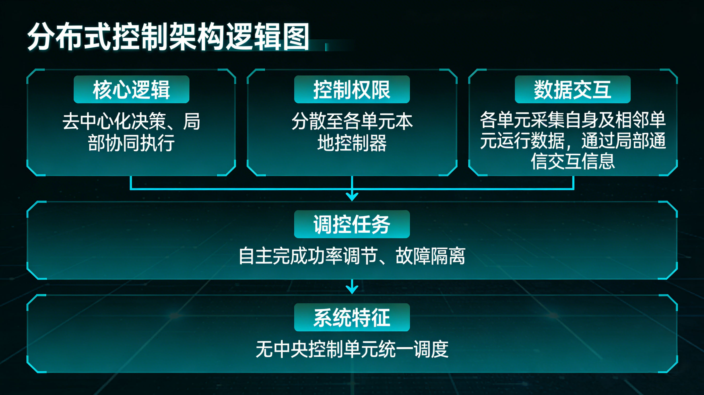 分布式控制摒弃了集中式的"集权"架构,核心逻辑是"去中心化决策、局部协同执行",将控制权限分散至各单元的本地控制器,各单元仅采集自身及相邻单元的运行数据,通过局部通信交互信息,自主完成功率调节、故障隔离等调控任务,无需中央控制单元的统一调度。