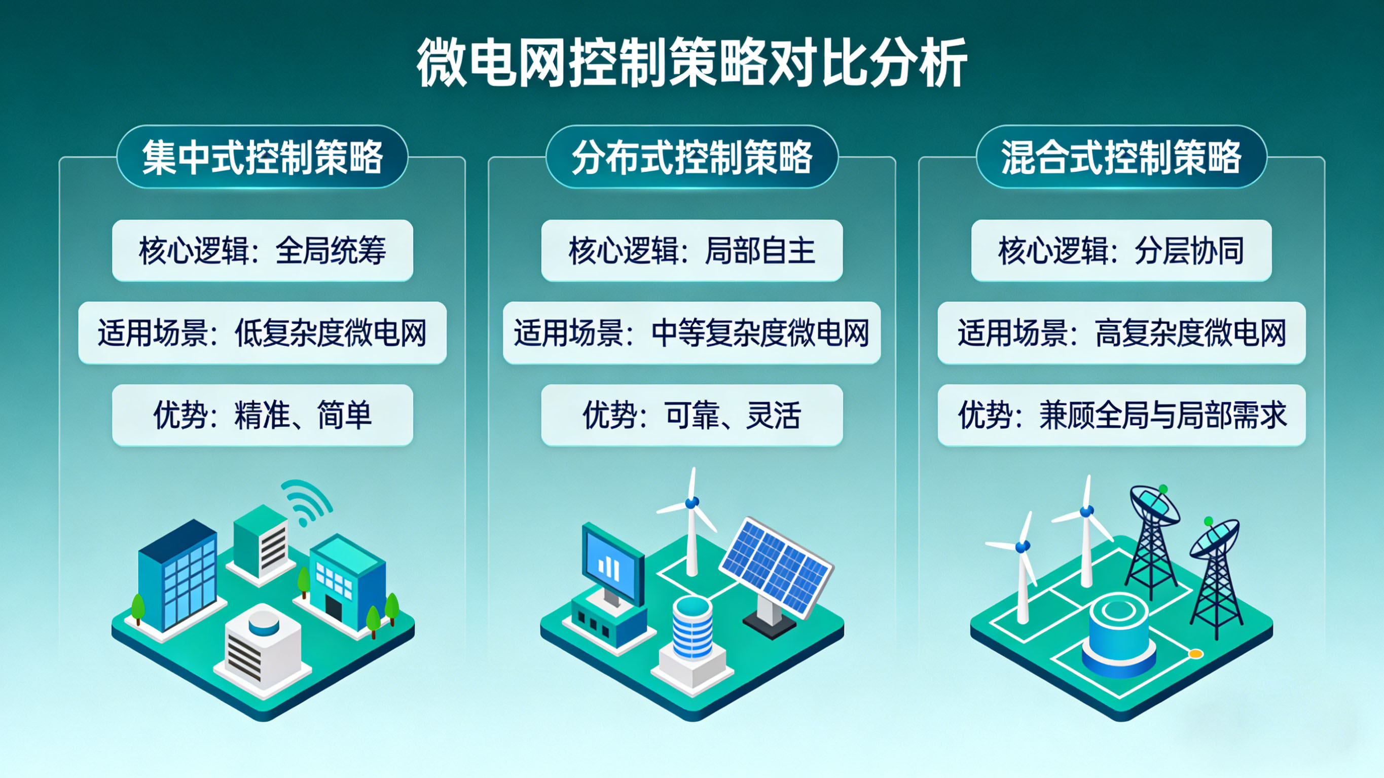 集中式、分布式与混合式控制策略,分别对应"全局统筹""局部自主""分层协同"三种核心逻辑,适用于不同复杂度的微电网场景。集中式是基础形态,优势在于精准与简单;分布式是去中心化升级,优势在于可靠与灵活;混合式是融合优化方向,优势在于兼顾全局与局部需求。深入理解三类控制策略的基础原理与差异,是微电网控制方案精准选型的前提。随着微电网规模化、复杂化发展,混合式控制将成为主流方向,通过技术创新持续优化分层协同逻辑,进一步提升微电网的运行效率与可靠性,为新型电力系统的构建提供核心支撑。