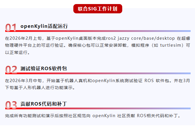 **OpenLoong SIG 将深度参与本次联合适配工作,**对接 openKylin 社区及相关 SIG,在机器人本体、系统运行环境与 ROS 软件栈之间开展协同适配与测试工作,配合完成从系统可运行验证、功能演示到社区回馈的完整技术流程。通过这一过程,OpenLoong 也将持续沉淀面向 RISC-V 架构的人形机器人系统级经验,为后续更大规模的具身智能开源协作提供参考范式。