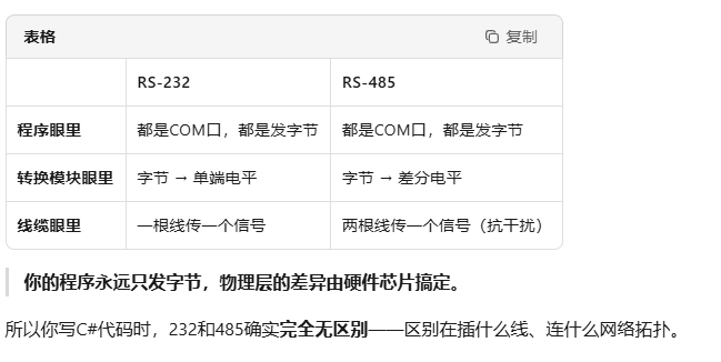 使用C#写一套串口通讯工具,是不是232和485都能使用,是因为C#代码层面完全一样 ,发字节的方式没有任何区别,但硬件层完全不同 ,232和485是物理层的两种不同标准。