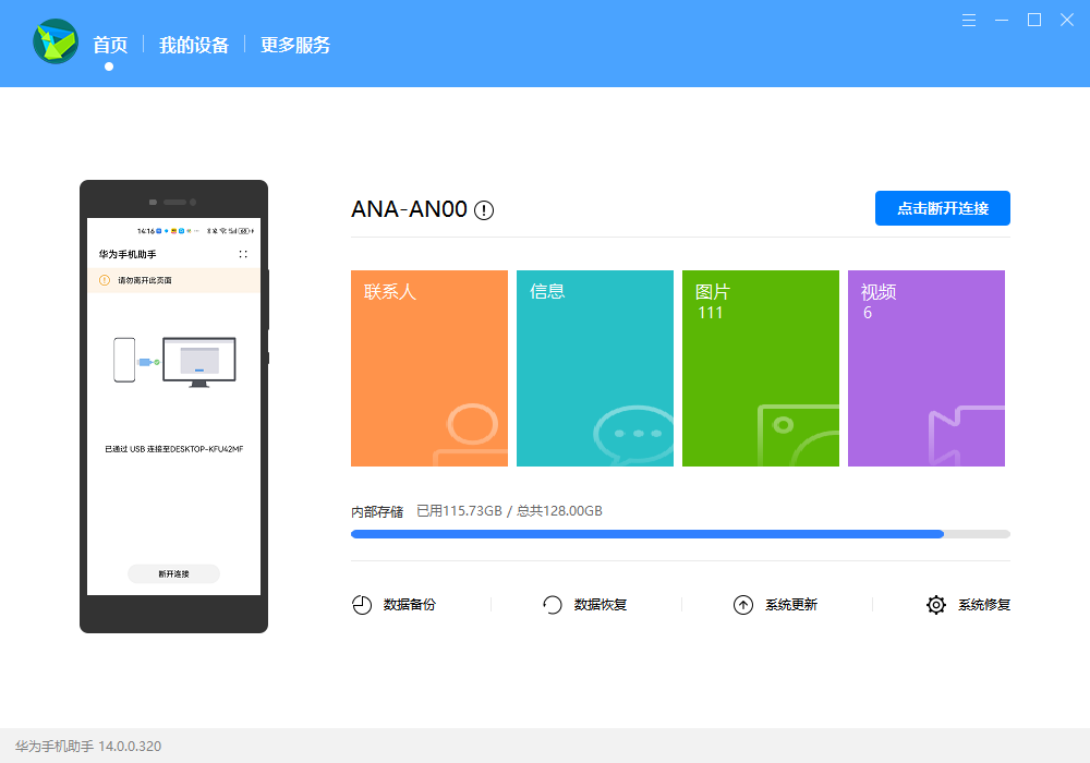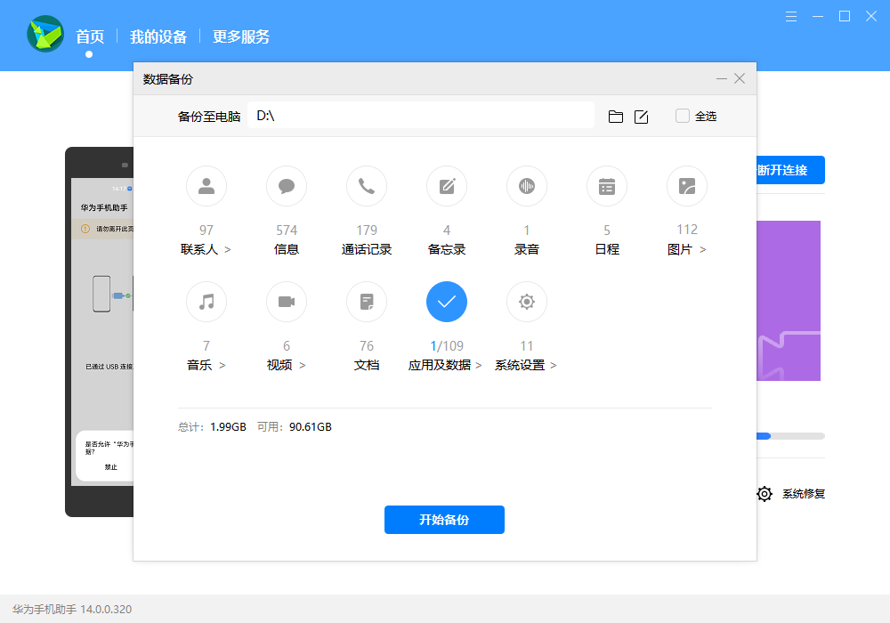 此时华为助手显示为识别到手机界面,我们点击数据备份,选择需要提取的应用数据,开始备份并设置备份密码,如图7、图8所示。