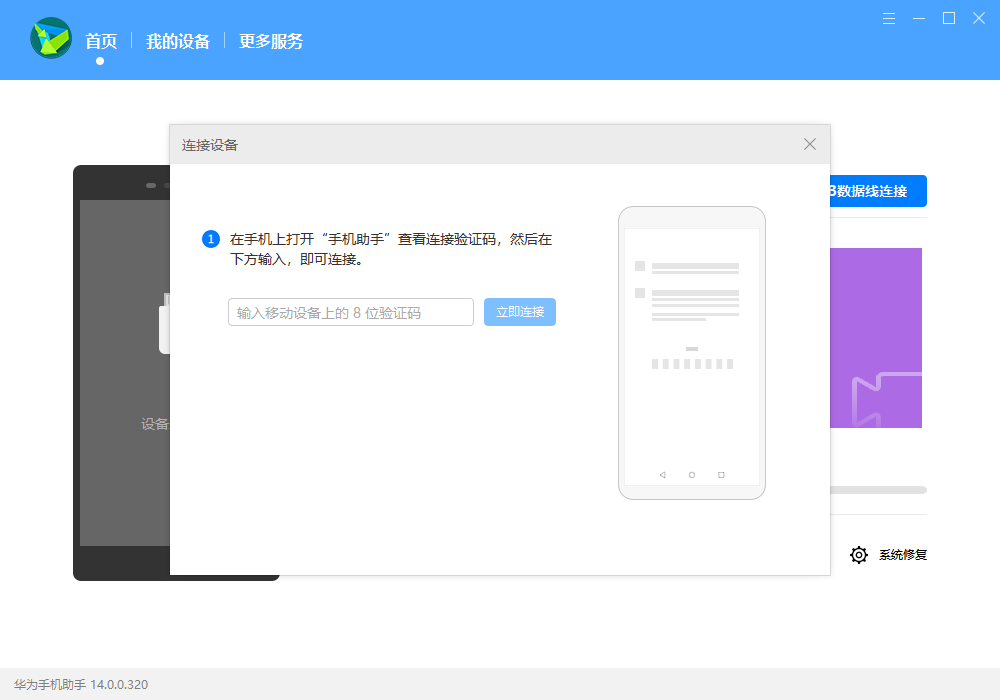 华为助手连接上后,输入手机端弹出的验证码,如图6所示。
