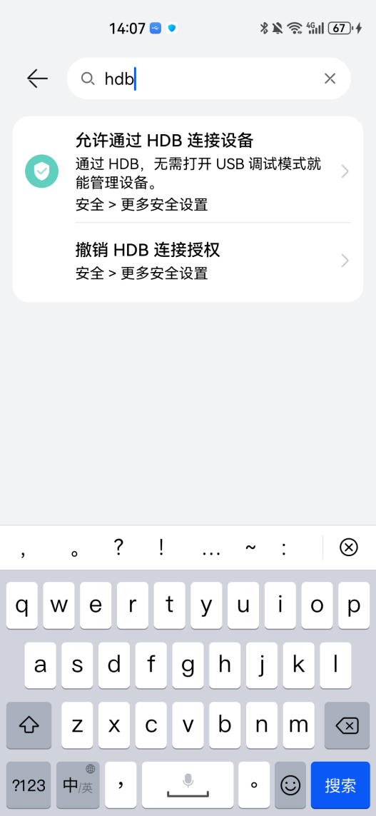 如果您知道隐私密码的话,可以直接输入,正常提取,如果您不知道隐私密码的话,到设置页面搜索HDB,点击"允许通过HDB连接设备"选项,如图2、图3所示;使用华为助手USB数据线连接手机,手机上点击确定允许开启HDB连接设备选项,如图4、图5所示。