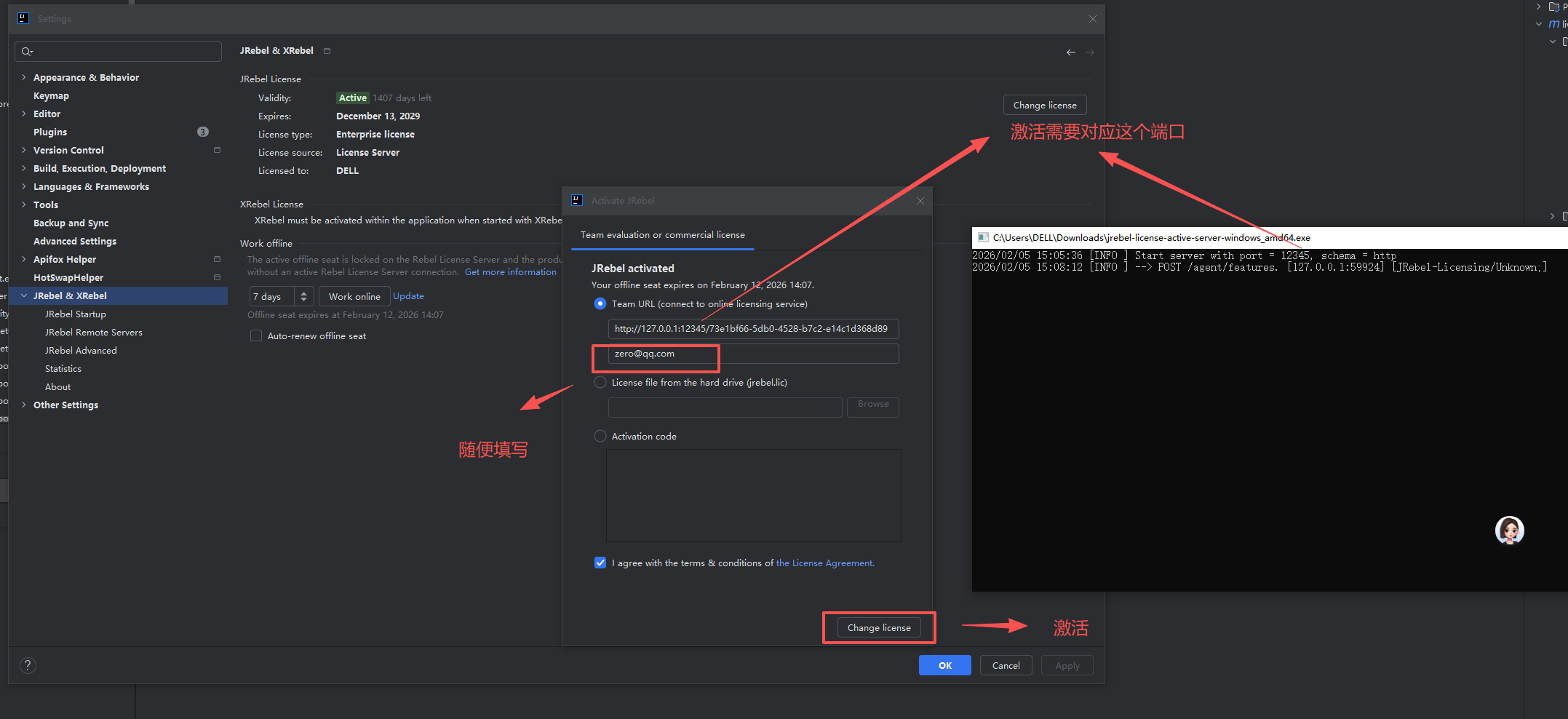 5.开始使用,第一个框填写http://127.0.0.1:12345/{GUID} guid为第四步生成的随机数,第二个框填写邮箱,**注意:**激活时,第二步启动得工具一定不能关闭