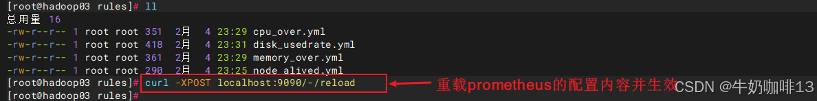 注意: rule_files就是用来指定告警规则文件的路径,可以使用相对路径和绝对路径,这里是相对路径,"*.yml"会加载当前rules目录下所有已.yml结尾的文件,要实现热加载告警规则文件,需要在启动prometheus的时候加上【--web.enable-lifecycle】参数(实现在不停服务的情况下实现配置文件的重新加载 ):