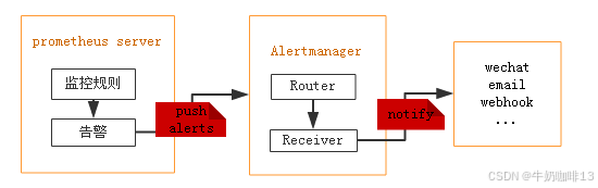 Prometheus server按告警规则(告警规则是在Prometheus上定义的,对应rule_files配置块)将警报发送到Alertmanager。然后,由Alertmanager 来管理这些警报,包括去重(Deduplicating)、分组(Grouping)、沉默(silencing),抑制(inhibition),聚合(aggregation),最终,通过邮件、slack、wbkhook等将告警通知 路由(route)给对应的联系人。