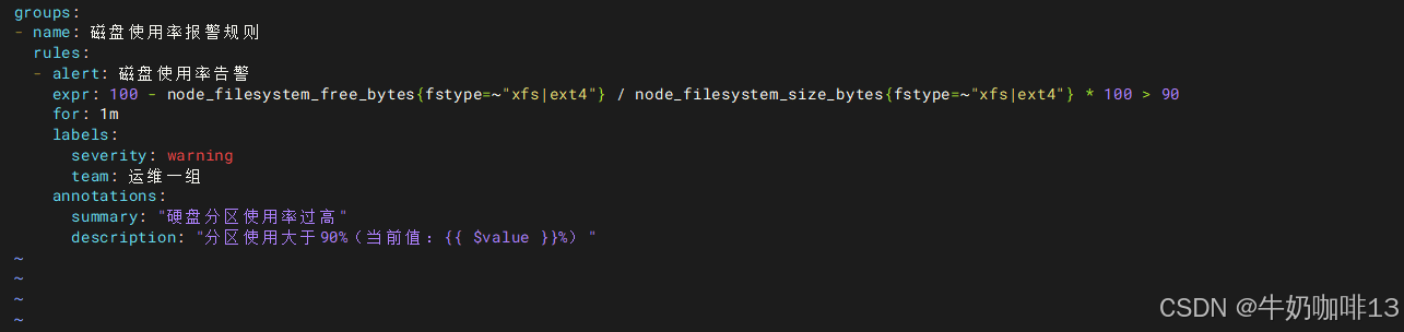 expr: 100 - node_filesystem_free_bytes{fstype=~"xfs|ext4"} / node_filesystem_size_bytes{fstype=~"xfs|ext4"} * 100 > 90