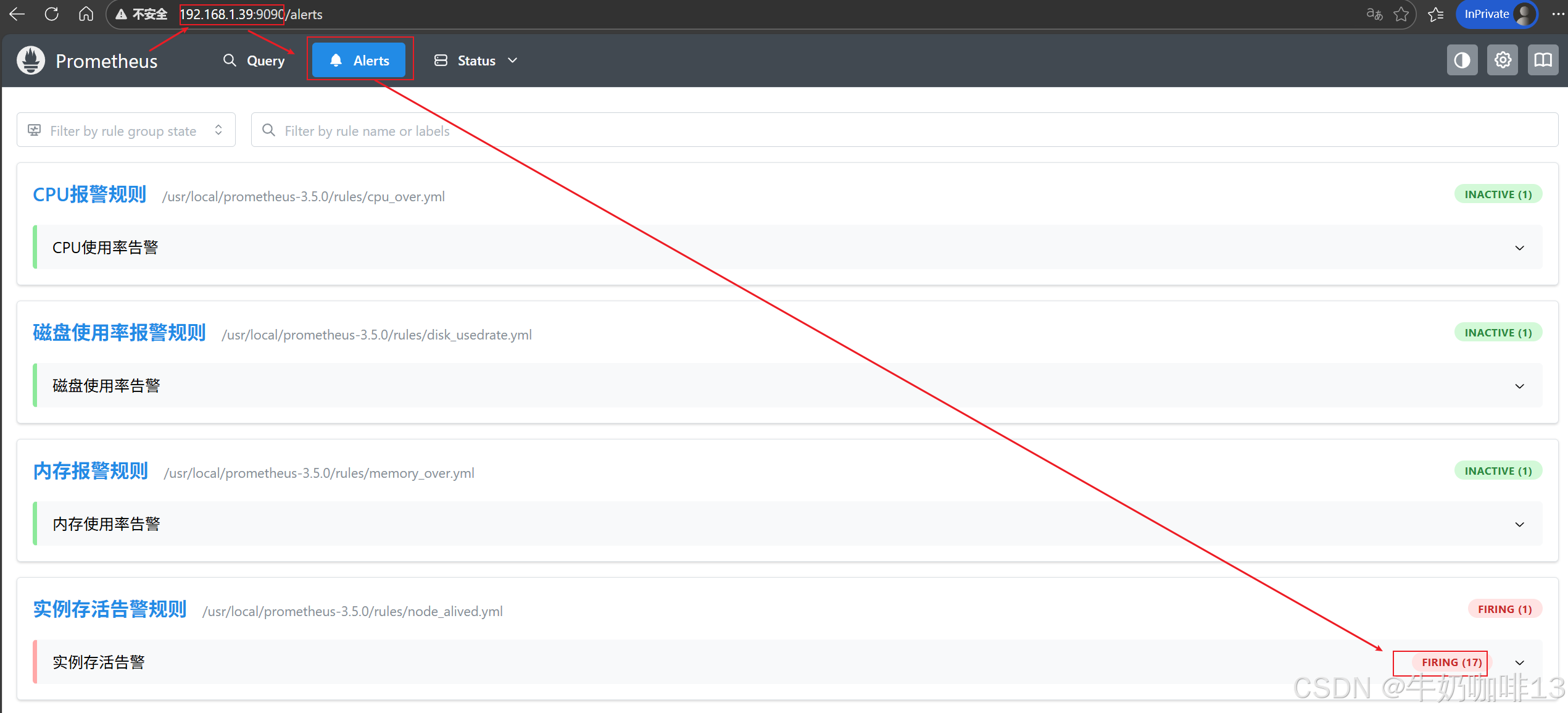**《2》告警规则:**告警规则实际上主要由 PromQL 进行定义,其实际意义是当表达式(PromQL)查询结果持续多长时间(During)后触发告警,是一个触发条件。